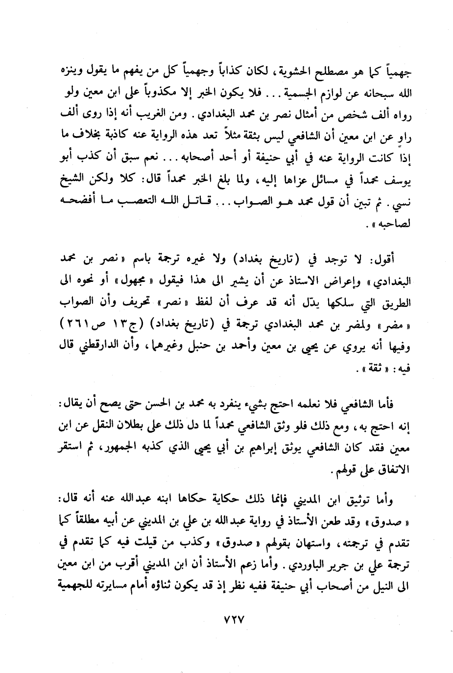 جهميا كما هو مصطلح الحشوية، لكان كذابا وجهميا كل من يفهم ما يقول وينزه الله سبحانه عن لوازم الجسيمة ... فلا يكون الخبر إلا مكذوبا على ابن معين ولو رواه ألف شخص من أمثال نصر بن محمد البغدادي. ومن الغريب أنه إذا روى ألف راو عن ابن معين أن الشافعي ليس بثقة مثلاً تعد هذه الرواية عنه كاذبة بخلاف ما إذا كانت الرواية عنه في أبي حنيفة أو أحد أصحابه ... نعم سبق أن كذب أبو يوسف محمداً في مسائل عزاها إليه، ولما بلغ الخبر محمدا قال: كلا ولكن الشيخ نسي. ثم تبين أن قول محمد هو الصواب ... قاتل الله التعصب ما أفضحه لصاحبه» .