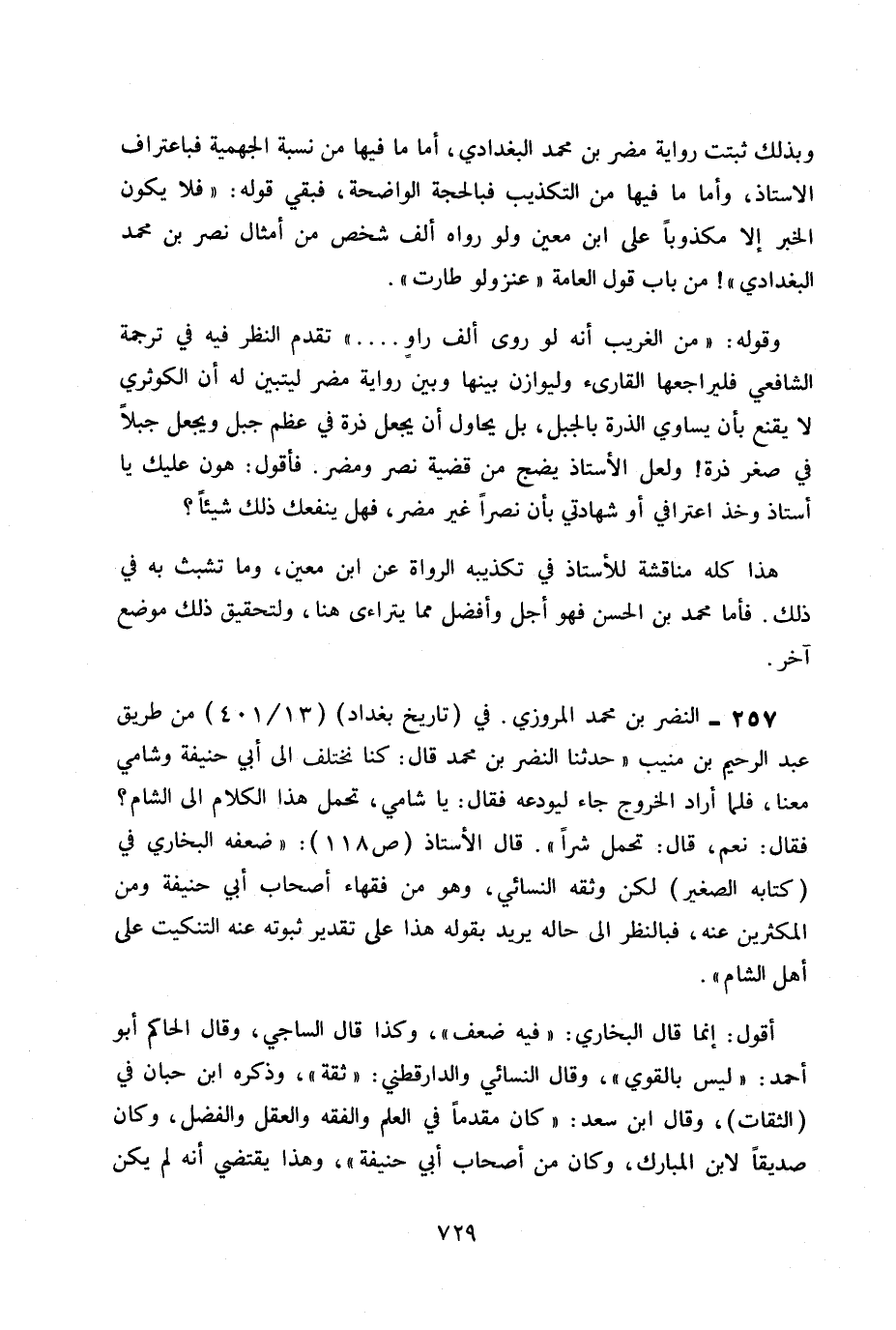 257- النضر بن محمد المروزي. في (تاريخ بغداد) 13 / 401 من طريق عبد الرحيم بن منيب «حدثنا النضر بن محمد قال: كنا نختلف إلى أبي حنيفة وشامي معنا، فلما أراد الخروج جاء ليودعه فقال: يا شامي، تحمل هذا الكلام إلى الشام؟ فقال: نعم، قال: تحمل سراً» . قال الأستاذ ص 118: «ضعفه البخاري في (كتابه الصغير) لكن وثقه النسائي، وهو من فقهاء أصحاب أبي حنيفة ومن المكثرين عنه، فبالنظر إلى حاله يريد بقوله هذا على تقدير ثبوته عنه التنكيت على أهل الشام» .