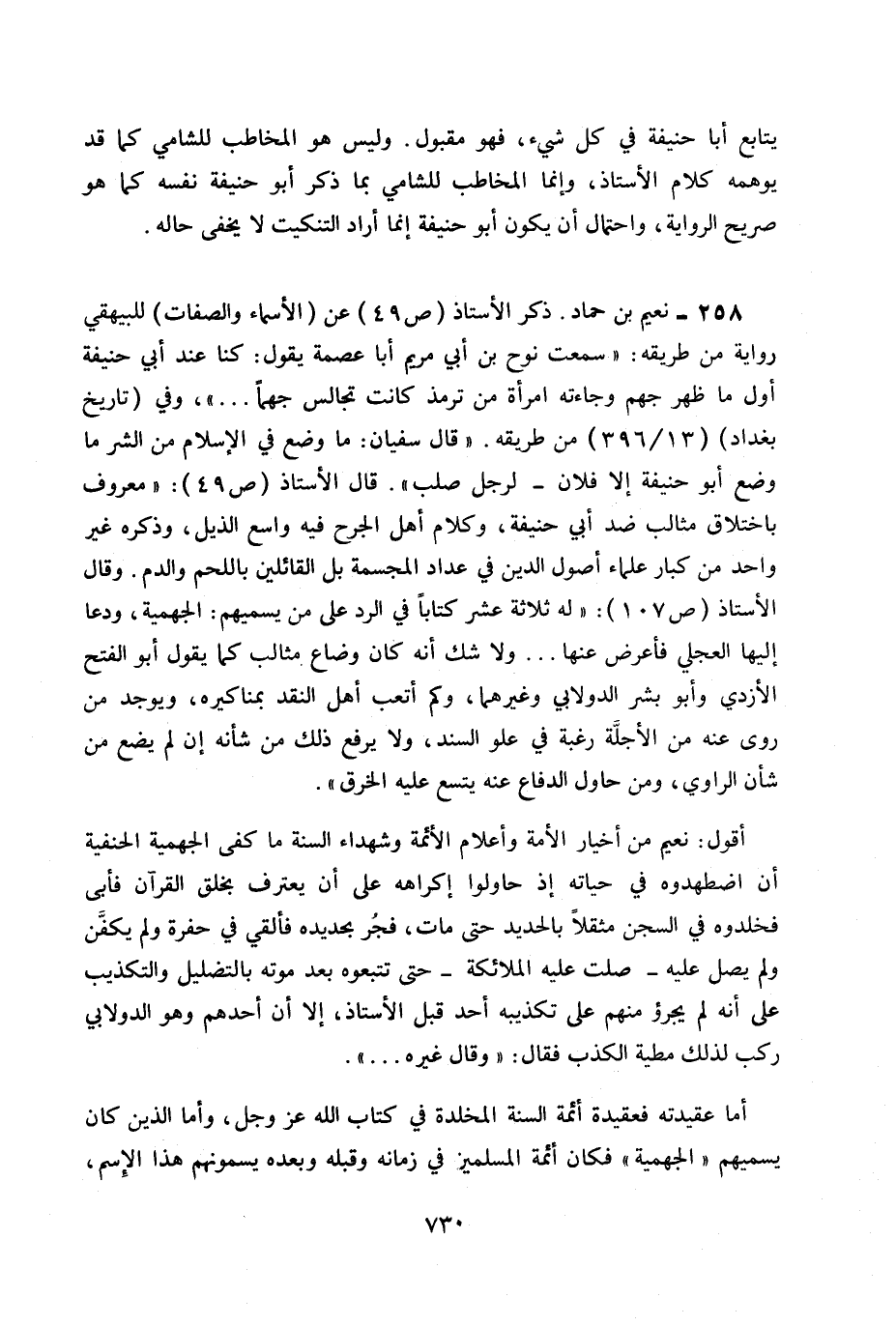 258- نعيم بن حماد. ذكر الأستاذ ص 49 عن (الأسماء والصفات) للبيهقي رواية من طريقة: «سمعت نوح بن أبي مريم أبا عصمة يقول: كنا عند أبي حنيفة أول ما ظهر جهم وجاءته امرأة من ترمذ كانت تجالس جهماً ... » وفي (تاريخ بغداد) 13 / 396 من طريقة. «قال سفيان: ما وضع في الإسلام من الشر ما وضع أبو حنيفة إلا فلان - لرجل صلب» . قال الأستاذ ص 49: «معروف باختلاق مثالب ضد أبي حنيفة، وكلام أهل الجرح فيه واسع الذيل، وذكره غير واحد من كبار علماء أصول الدين في عداد المجسمة بل القائلين باللحم والدم. وقال الأستاذ ص 107: «له ثلاثة عشر كتاباً في الرد على من يسميهم: الجهمية، ودعا إليها العجلي فاعرض عنها ... ولا شك أنه كان وضاع مثالب كما يقول أبو الفتح الأزدي وأبو بشر الدولابي وغيرهما، وكم أتعب أهل النقد بمناكيره، ويوجد من روى عنه من الأجلة رغبة في علو السند، ولا يرفع ذلك من شأنه إن لم يضع من شأن الراوي، ومن حاول الدفاع عنه يتسع عليه الخرق» .