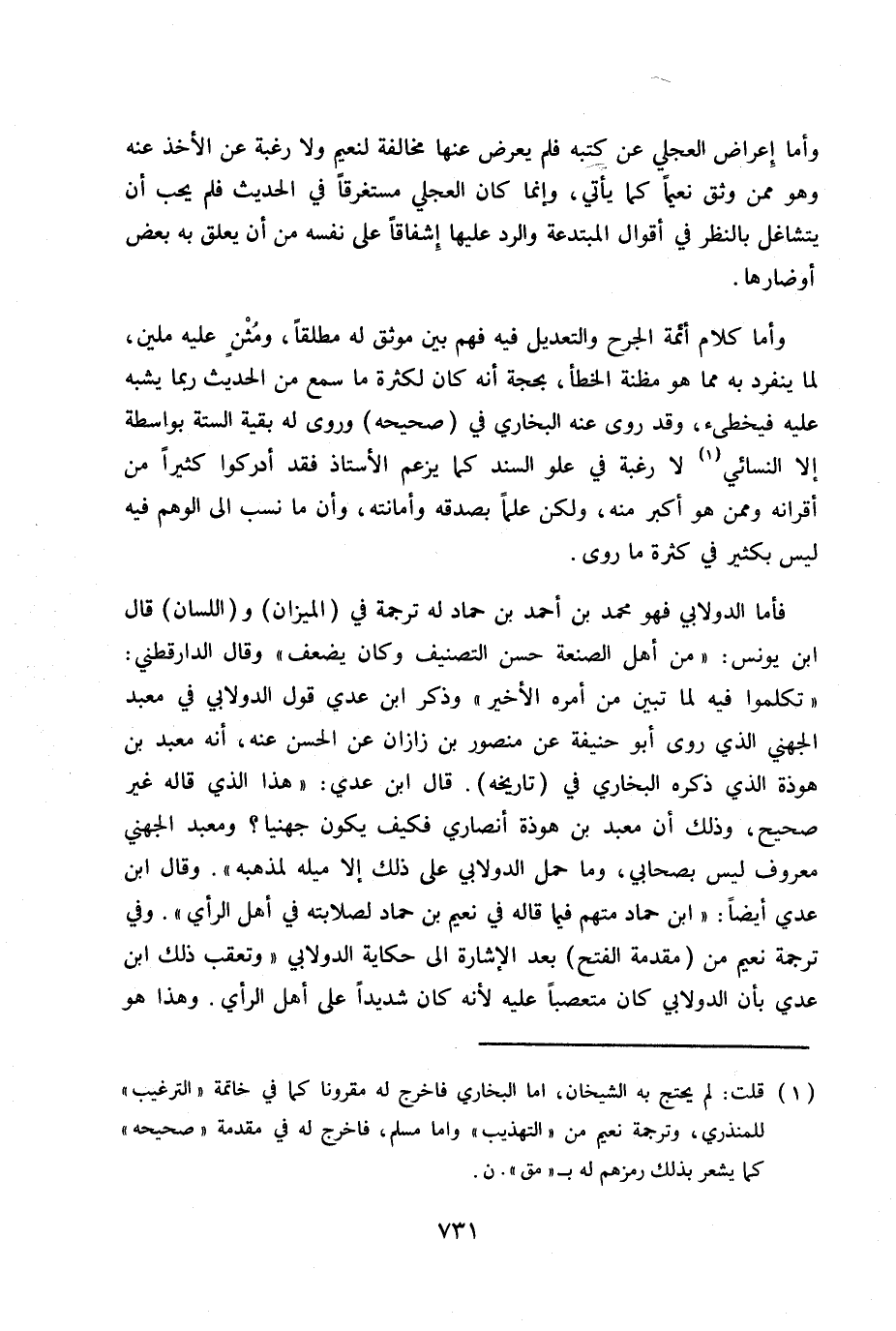 وأما إعراض العجلي عن كتبه فلم يعرض عنها مخالفة لنعيم ولا رغبة عن الأخذ عنه وهو ممن وثق نعيماً كما يأتي، وإنما كان العجلي مستغرقاً في الحديث فلم يحب أن يتشاغل بالنظر في أقوال المبتدعة والرد عليها إشفاقاً على نفسه من أن يعلق به بعض أو ضارها.