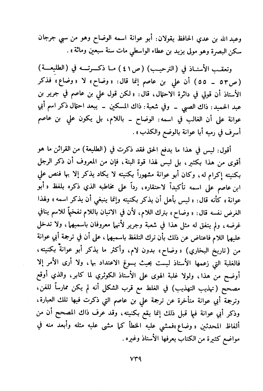 أقول: ليس في هذا ما يدفع الحق فقد ذكرت في (الطليعة) من القرائن ما هو أقوى من هذا بكثير، بل ليس لهذا قوة البتة، فإن من المعروف أن ذكر الرجل بكنيته إكرام له، وكان أبو عوانة مشهوراً بكنيته لا يكاد يذكر إلا بها فنص علي بن عاصم على اسمه تأكيداً لاحتقاره، رداً على مخاطبة الذي ذكره بلفظ «أبو عوانة» كأنه قال: «ليس بأهل أن يذكر بكنيته وإنما ينبغي أن يذكر اسمه» ولهذا الغرض نفسه قال: «ليس بأهل أن يذكر بكنيته وإنما ينبغي أن يذكر اسمه» ولهذا الغرض نفسه قال: «وضاح» بترك اللام، لأن في الإتيان باللام تفخيماً للاسم ينافي غرضه، ولم يتفق له مثل هذا في شعبة وجرير لأنهما معروفان باسميهما، ولا تدخل عليهما اللام فاعتاض عن ذلك بأن ترك التلفظ باسميهما، على أن في ترجمة أبي عوانة من (تاريخ البخاري) «وضاع» بدون لام، وأكثر ما يذكر أبو عوانة بكنيته، فالغلبة التي زعمها الأستاذ ليست بحيث يسوغ الاعتداد بها، ولا أرى الأمر إلا أو ضح من هذا، ولولا غلبة الهوى على الأستاذ الكوثري لما كابر، والذي أو قع مصحح (تهذيب التهذيب) في الغلط مع قرب الشكل أنه لم يكن ممارساً للفن، وترجمة أبي عوانة متأخرة عن ترجمة علي بن عاصم التي ذكرت فيها تلك العبارة، وذكر أبي عوانة فيما قبل ذلك يقع بكنيته، وقد عرف ذاك المصحح أن من ألفاظ المحدثين «وضاع» فمشى عليه الخطأ كما مشى عليه مثله وأبعد منه في مواضع كثيرة من الكتاب يعرفها الأستاذ وغيره.