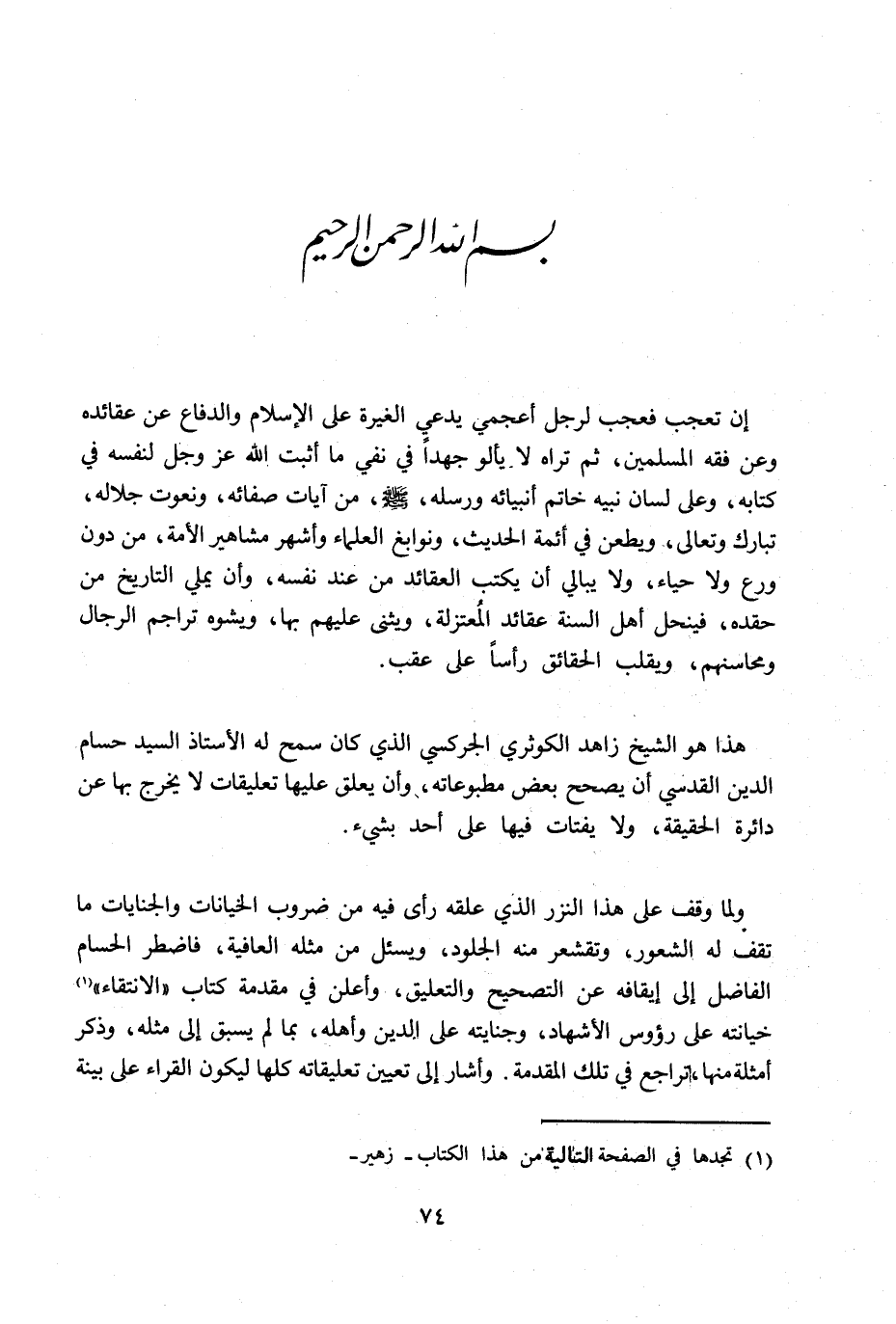 إن تعجب فعجب لرجل أعجمي يدعي الغيرة على الإسلام والدفاع عن عقائده وعن فقه المسلمين، ثم تراه لا- يألو جهداً في نفي ما أثبت الله عز وجل لنفسه في كتابه، وعلى لسان نبيه خاتم أنبيائه ورسله، - صلى الله عليه وسلم -، من آيات صفائه، ونعوت جلاله، تبارك وتعالى، ويطعن في أئمة الحديث، ونوابغ العلماء وأشهر مشاهير الأمة، من دون ورع ولا حياء، ولا يبالي أن يكتب العقائد من عند نفسه، وأن يملي التاريخ من حقده، فينحل أهل السنة عقائد المُعتزلة، ويثنى عليهم بها، ويشوه تراجم الرجال ومحاسنهم، ويقلب الحقائق رأساً على عقب.