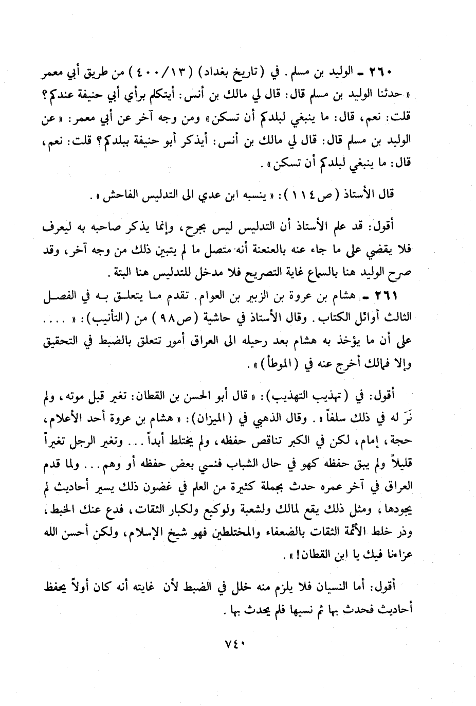 261- هشام بن عروة بن الزبير بن العوام. تقدم ما يتعلق به في الفصل الثالث أوائل الكتاب. وقال الأستاذ في حاشية ص 98 من (التأنيب) : « ... على أن ما يؤخذ به هشام بعد رحيله إلى العراق أمور تتعلق بالضبط في التحقيق وإلا فمالك أخرج عنه في (الموطأ) » .
