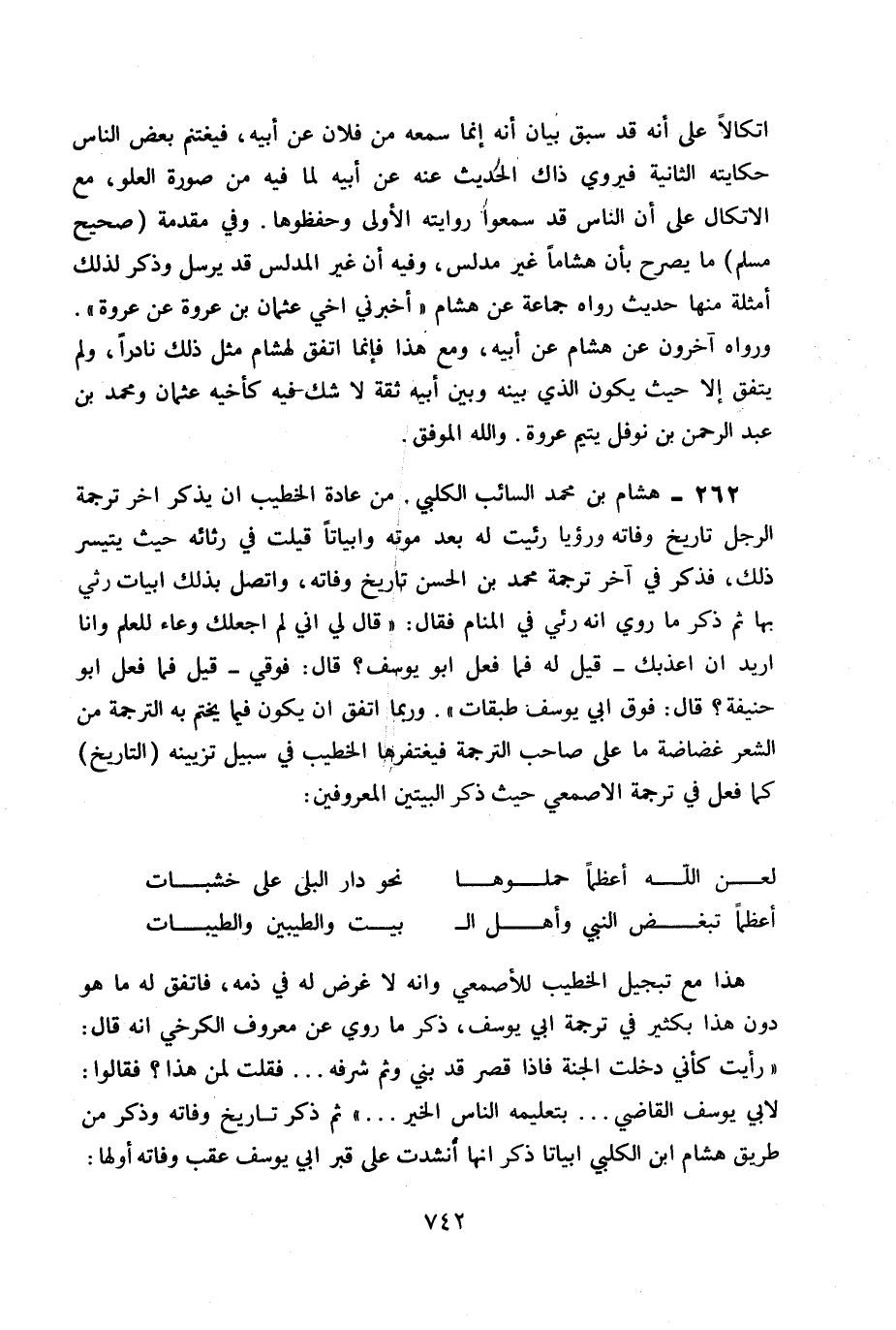 262- هشام بن محمد بن السائب الكلبي. من عادة الخطيب أن يذكر آخر ترجمة الرجل تاريخ وفاته ورؤيا رئيت له بعد موته وأبياتاً قيلي في رثائه حيث يتيسر ذلك، فذكر في آخر ترجمة محمد بت الحسن تاريخ وفاته، واتصل بذلك أبيات رثى بها ذكر ما روي أنه رئي في المنام فقال: «قال لي إني لم أجعلك وعاء للعلم وأنا أريد أن أعذبك - قيل له فما فعل أبو يوسف؟ قال: فوقي - قيل فما فعل أبو حنيفة؟ قال: فوق أبي يوسف بطبقات» . وربما اتفق أن يكون فيما يختم به الترجمة من الشعر غضاضة ما على صاحب الترجمة فيغتفرها الخطيب في سبيل تزيينه (التاريخ) كما فعل في ترجمة الأصمعي حيث ذكر البيتين المعروفين: