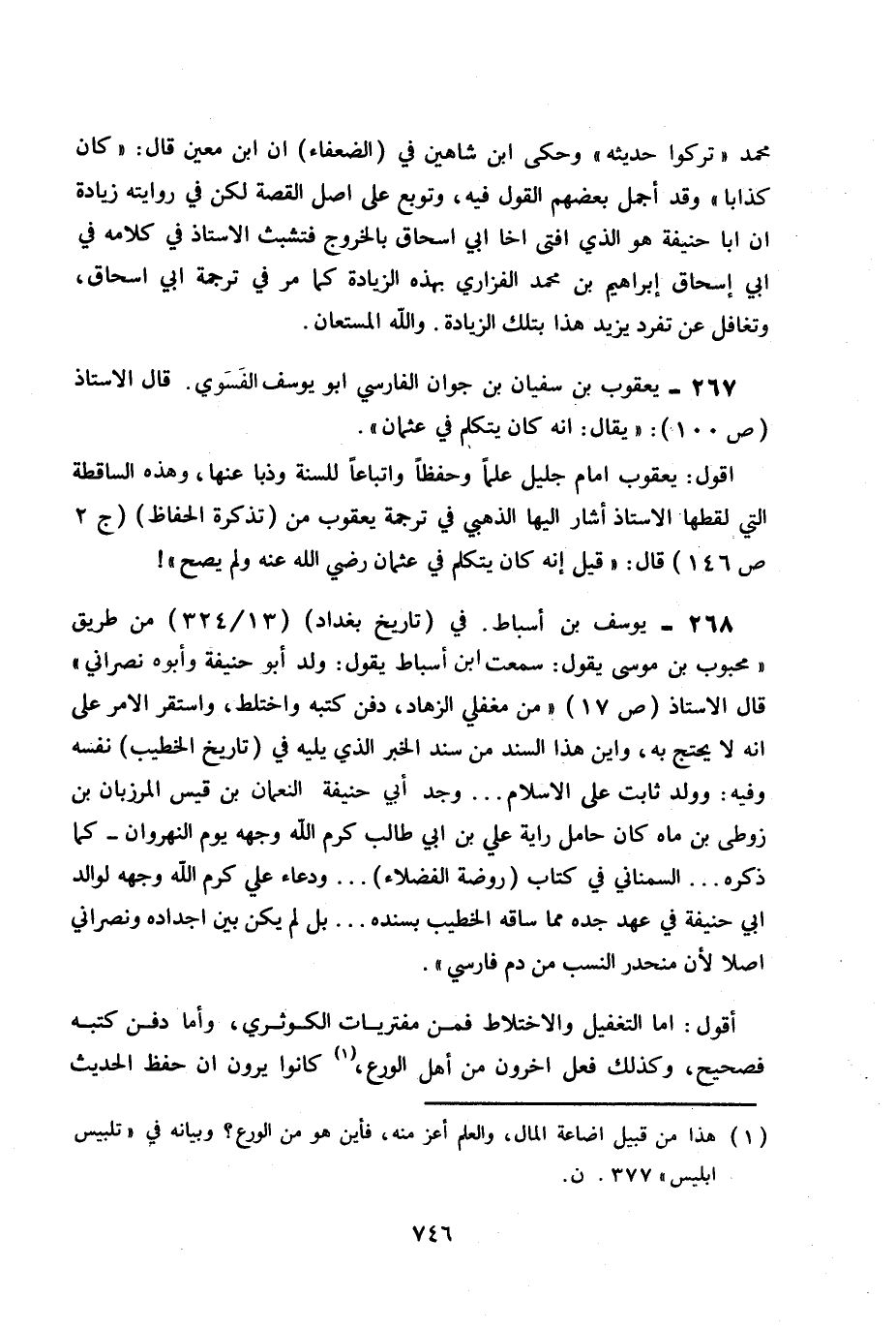 268- يوسف بن أسباط. في (تاريخ بغداد) 13 / 324 من طريق «محبوب بن موسى يقول: سمعت ابن أسباط يقول: ولد أبو حنيفة وأبوه نصراني» قال الأستاذ ص 17 «من مغفلي الزهاد، دفن كتبه واختلط، واستقر الأمر على أنه لا يحتج به، وأين هذا السند من سند الخبر الذي يليه في (تاريخ الخطيب) نفسه وفيه: وولد ثابت على الإسلام ... وجد أبي حنيفة النعمان بن قيس المرزبان بن زوطى بن ماه كان حامل راية علي بن أبي طالب كرم الله وجهه يوم النهر - كما ذكره ... السمناني في كتاب (روضة الفضلاء) ... ودعاء علي كرم الله وجهه لوالد أبي حنيفة في عهد جده مما ساقه الخطيب بسنده ... بل لم يكن بين أجداده نصراني أصلاً لأنه منحدر النسب من دم فارسي» .