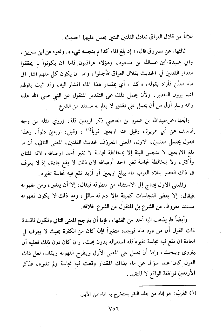 ثالثها: عن مسروق قال: «إذا بلغ الماء كذا لم ينجسه شيء» ونحوه عن ابن سيرين وأبي عبيدة بن عبد الله بن مسعود، وهؤلاء عراقيون فإما أن يكونوا لم يحققوا مقدار القلتين في الحديث بقلال العراق فأجملوا، وإما أن يكون كل منهم أشار إلى ماء معّين فأراد بقوله: «كذا» أي بمقدار هذا الماء المشار إليه، وقد ثبت بقولهم أنهم يرون التقدير، ولأن يحمل ذلك على التقدير المنقول عن النبي - صلى الله عليه وسلم - أولى من أن يحمل على تقدير لا يعلم له مستند من الشرع.