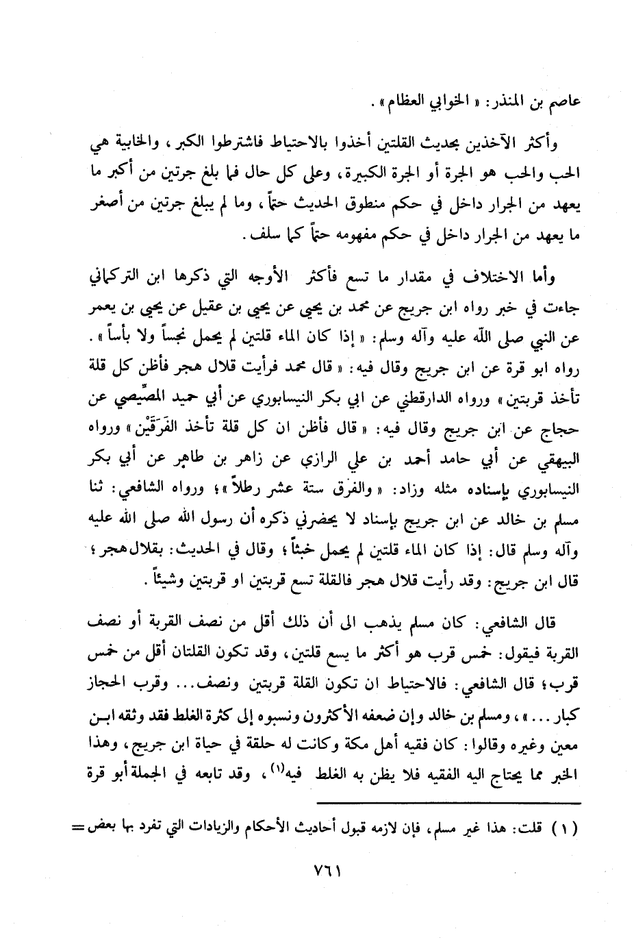 وأكثر الآخذين بحديث القلتين أخذوا بالاحتياط فاشترطوا الكبر والخابية هي الحب والحب هو الجرة أو الجرة الكبيرة، وعلى كل حال فما بلغ جرتين من أكبر ما يعهد من الجرار داخل في الحكم منطوق الحديث حتماً وما لم يبلغ الجرتين من اصغر ما يعهد من الجرار داخل في حكم مفهومه حتماً كما سلف.