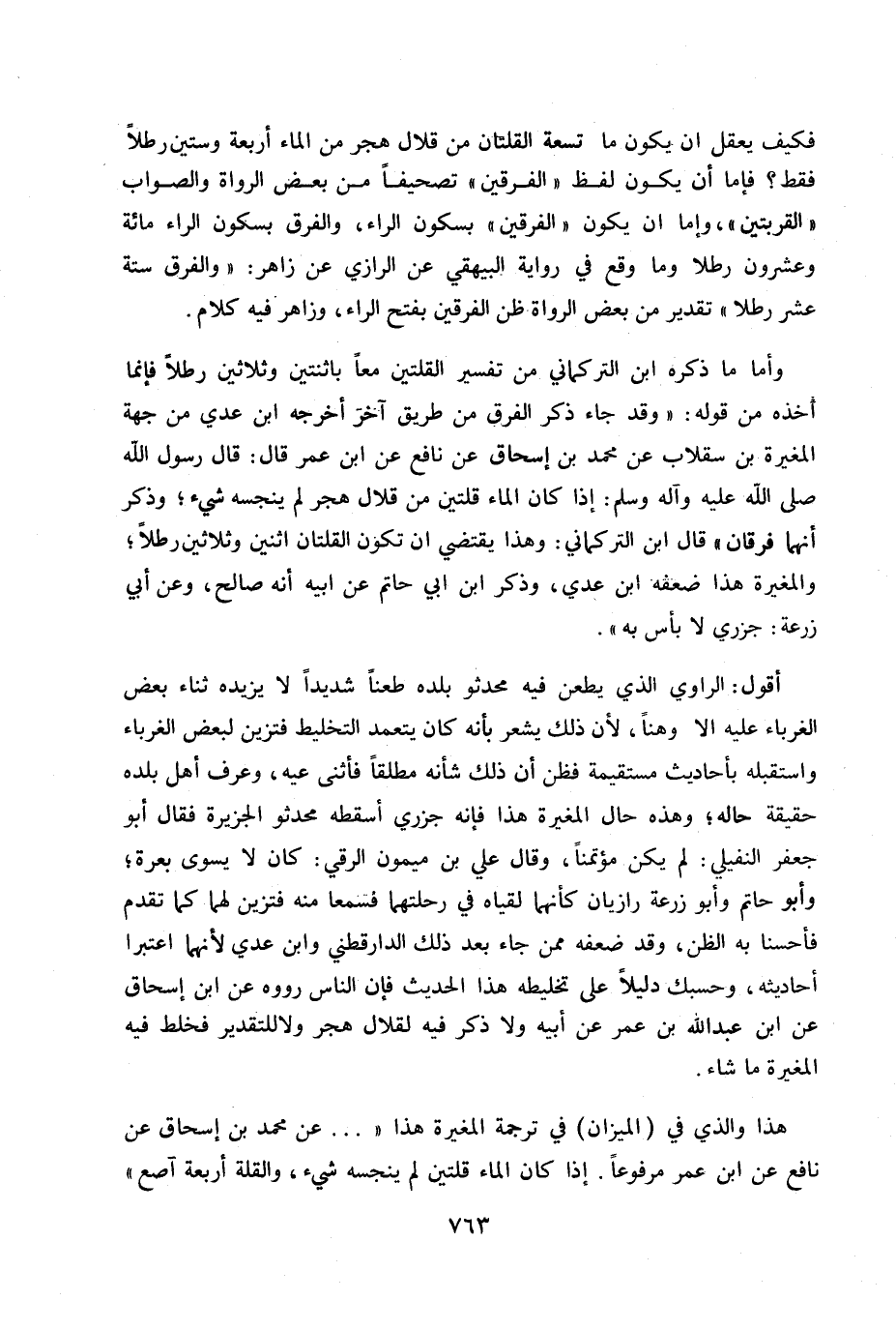 وأما ما ذكره ابن التركماني من تفسير القلتين معاً باثنتين وثلاثين رطلاً فإنما أخذه من قوله «وقد جاء ذكر الفرق من طريق آخر أخرجه ابن عدي من جهة المغيرة بن سقلاب عن محمد بن إسحاق عن نافع عن ابن عمر قال: قال رسول الله صلى الله عليه وسلم: إذا كان الماء قلتين من قلال هجر لم ينجسه شيء وذكر أنهما فرقان» قال ابن تركماني: وهذا يقتضي أن تكون قلتان اثنين وثلاثين رطلاً. والمغيرة هذا ضعفه ابن عدي، وذكر ابن أبي حاتم عن أبيه أنه صالح، وعن أبي زرعة: جزري لا بأس به»