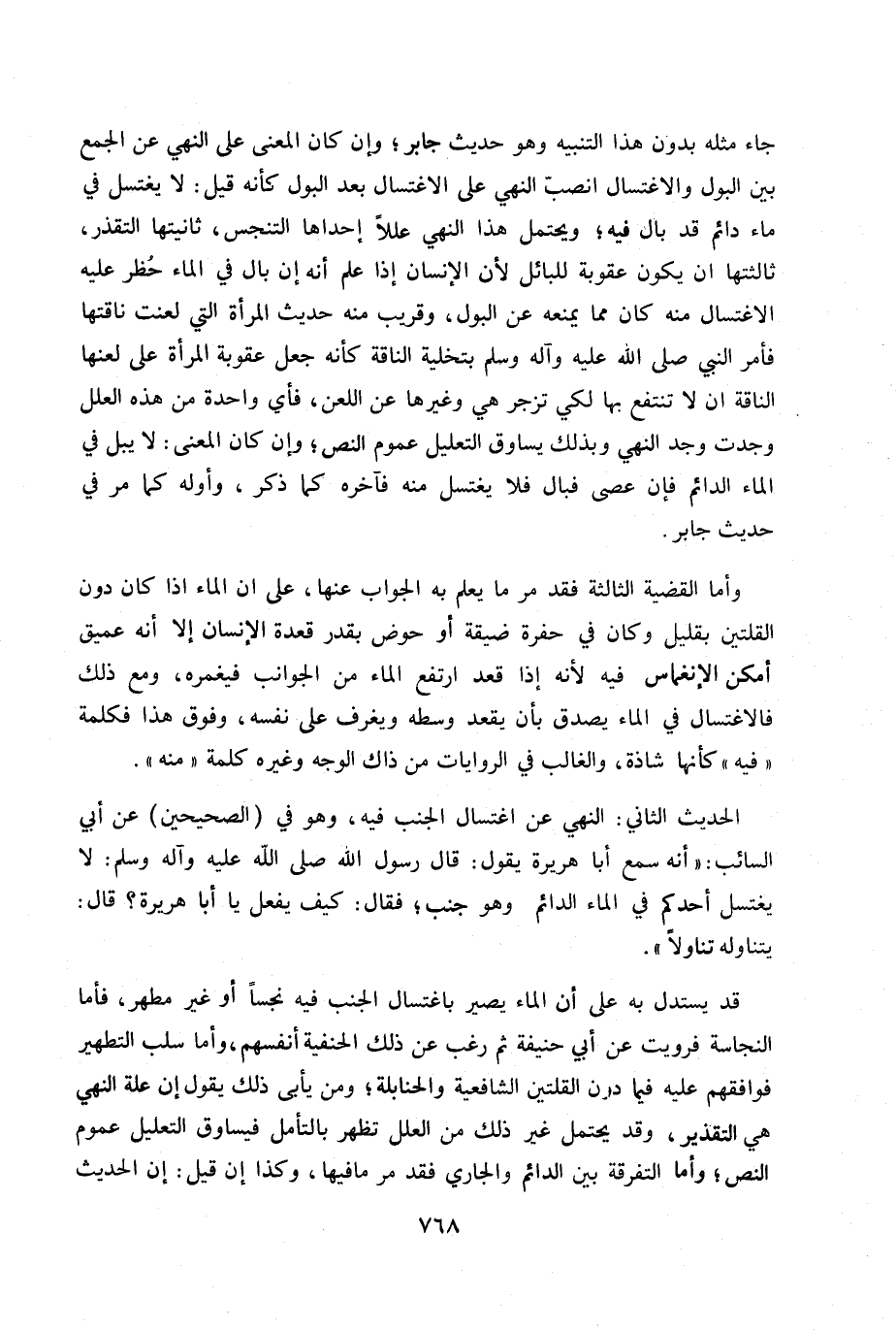 جاء مثله بدون هذا التنبيه وهو حديث جابر؛ وإن كان المعنى على النهي عن الجمع بين البول والاغتسال انصب النهي على الاغتسال بعد البول كأنه قيل: لا يغتسل في ماء دائم قد بال فيه؛ ويحتمل هذا النهي عللا إحداها التنجس، ثانيتها التقذر، ثالثتها إن يكون عقوبة للبائل لان الإنسان إذا علم أنه إن بال في الماء حضر علية الاغتسال منه كان مما يمنعه عن البول، وقريب منه حديث المرأة التي لعنت ناقتها فأمر النبي - صلى الله عليه وسلم - بتخلية الناقة كأنة جعل عقوبة المرأة على لعنها الناقة أن لا تنتفع بها لكي تزجر هي وغيرها عن اللعن، فأي واحدة من هذه العلل وجدت النهي وبذلك يساوق التعليل عموم النص؛ وإن كان المعنى: لا يبل في الماء الدائم فإن عصى فبال فلا يغتسل منه فآخره كما ذكر، وأوله كما مر في حديث جابر.