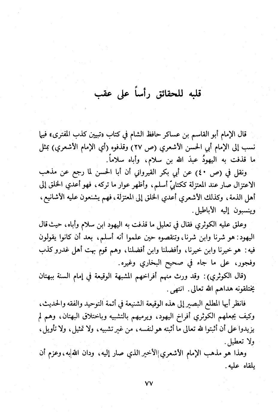 قال الإمام أبو القاسم بن عساكر حافظ الشام في كتاب "تبيين كذب المفترى" فيما نسب إلى الإمام أبي الحسن الأشعري (ص 27) وقذفوه (أي الإمام الأشعري) بمثل ما قذفت به اليهودُ عبدَ الله بن سلام، وأباه سلاماً.