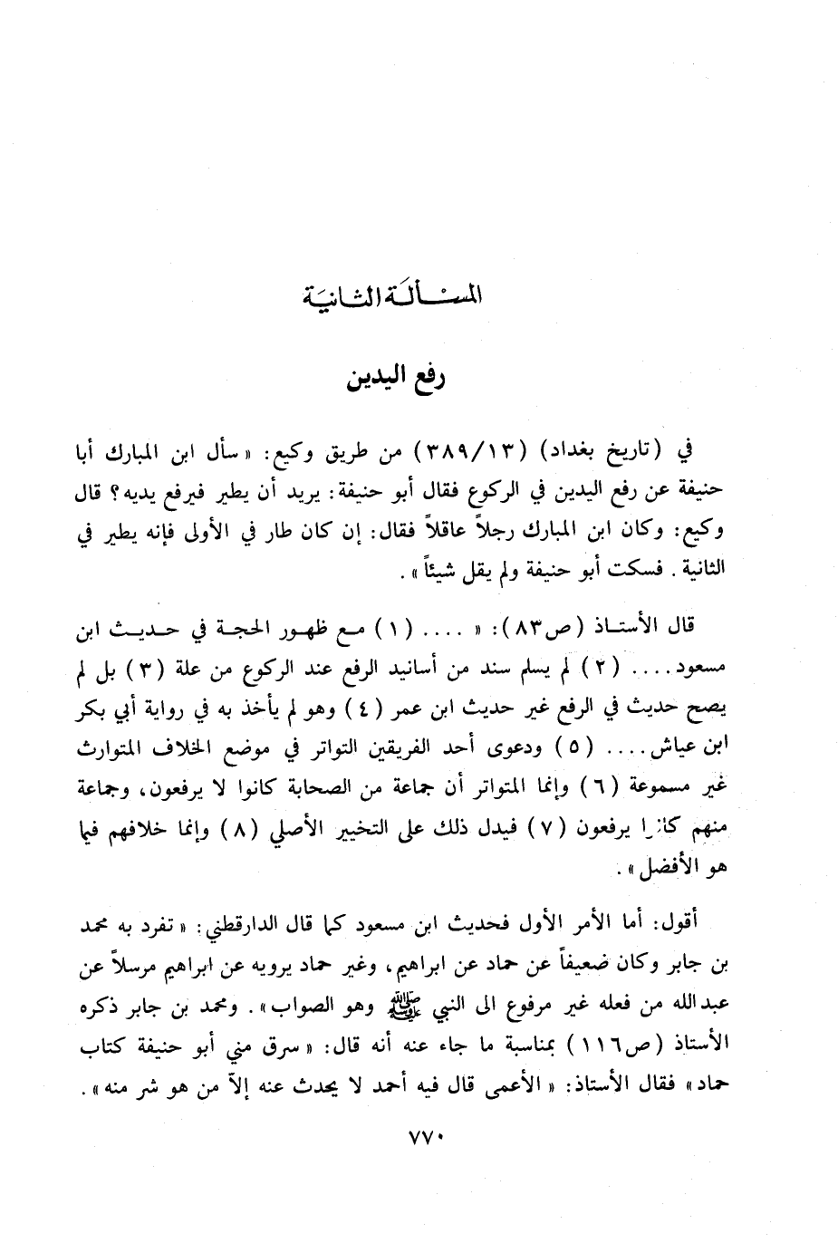 قال الأستاذ ص 83: « ... (1) مع ظهور الحجة في حديث ابن مسعود ... (2) لم يسلم سند من أسانيد الرفع عند الركوع من علة (3) بل لم يصح حديث في الرفع غير حديث ابن عمر (4) وهو لم يأخذ به في رواية أبي بكر بن عياش ... (5) ودعوى أحد الفرقين التواتر في موضع الخلاف المتوارث غير مسموعة (6) وإنما المتواتر أن جماعة من الصحابة كانوا لا يرفعون، وجماعة منهم كانوا يرفعون (7) فيدل ذلك على التخيير الأصلي (8) وإنما خلافهم فيما هو الأفضل» .