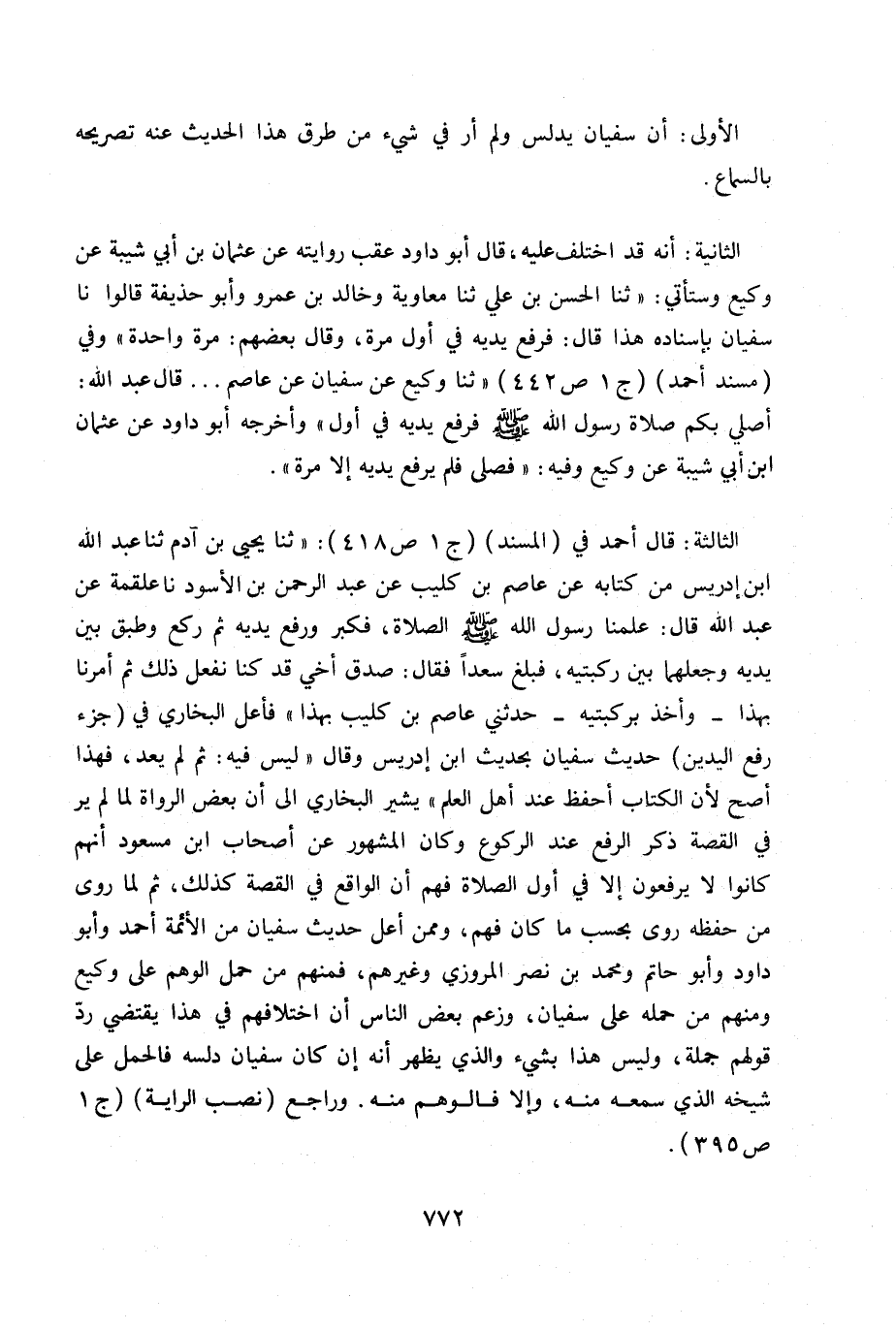الثالثة: قال أحمد في (المسند) ج1ص 418: «ثنا يحيى بن آدم ثنا عبد الله بن إدريس من كتابه عن عاصم بن كليب عن عبد الرحمن بن الأسود نا علقمة عن عبد الله قال: علمنا رسول الله - صلى الله عليه وسلم - الصلاة، فكبر ورفع يديه ثم ركع وطبق بين يديه وجعلها بين ركبتيه، فبلغ سعداً فقال، صدق أخي قد كنا نفعل كذلك ثم أمرنا بهذا - وأخذ بركبتيه - حدثني عاصم بن كليب بهذا» فأعل البخاري في (جزء رفع اليدين) حديث سفيان بحديث ابن إدريس وقال «ليس فيه: ثم لم يعد، فهذا أصح لأن الكتاب أحفظ عند أهل العلم» يشير البخاري إلى بعض الرواة لما لم ير في القصة ذكر الرفع عند الركوع وكان المشهور عن أصحاب ابن مسعود أنهم كانوا لا يرفعون إلا في أول الصلاة فهم أن الواقع في القصة كذلك، ثم لما روى من حفظه بحسب ما كان فهم، وممن أعل حديث سفيان من الأئمة أحمد وأبو داود ,ابوحاتم ومحمد بن نصر المروزي وغيرهم، فمنهم من حمل الوهم على وكيع ومنهم من حمله على سفيان، وزعم بعض الناس أن اختلافهم في هذا يقتضي ردّ قولهم جملة، وليس هذا بشيء والذي يظهر أنه كان سفيان دلسه فالحمل على شيخه الذي سمعه منه، وإلا فالوهم. وراجع (نصب الراية) (ج1 ص 395) .