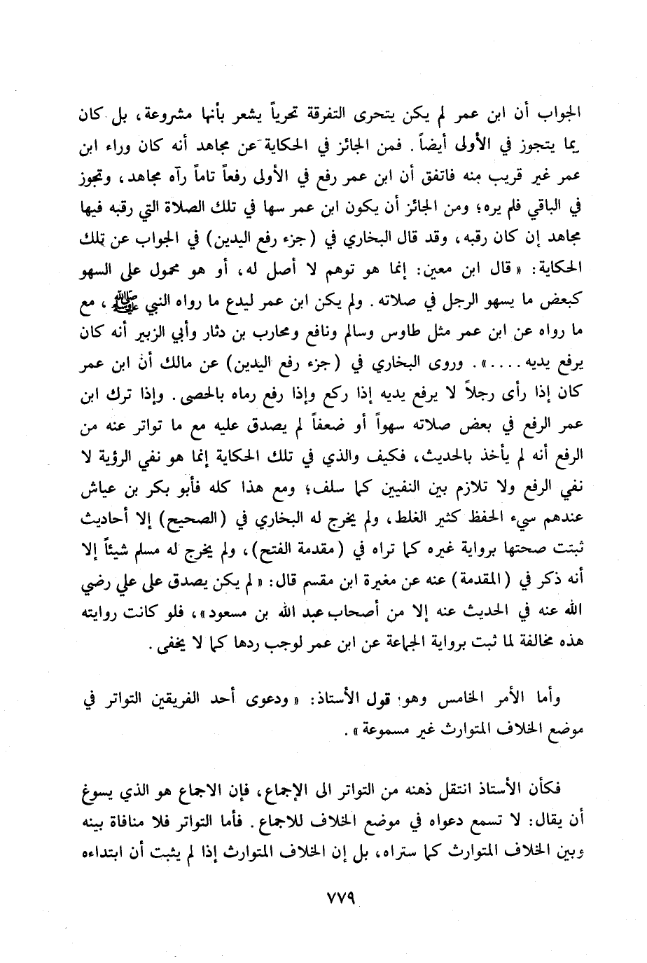 وإذا ترك ابن عمر الرفع في بعض صلاته سهواً أو ضعفاً لم يصدق عليه مع ما تواتر عنه من الرفع أنه لم يأخذ بالحديث، فكيف والذي في تلك الحكاية إنما هو نفي الرؤية لا نفي الرفع ولا تلازم بين النفيين كما سلف. ومع هذا كله فأبو بكر بن عياش عندهم شيء الحفظ كثير الغلط، ولم يخرج له البخاري في (الصحيح) إلا أحاديث ثبتت صحتها برواية غيره كما تراه في (مقدمة الفتح) ولم يخرج له مسلم شيئاً إلا أنه ذكر في (المقدمة) عنه عن مغيره ابن مقسم قال: «لم يكن يصدق على على رضي الله عنه في الحديث عنه إلا من أصحاب عبد الله بن مسعود» ، فلو كانت روايته هذه مخالفة لما ثبت برواية الجماعة عن ابن عمر لوجب ردها كما لا يخفى.