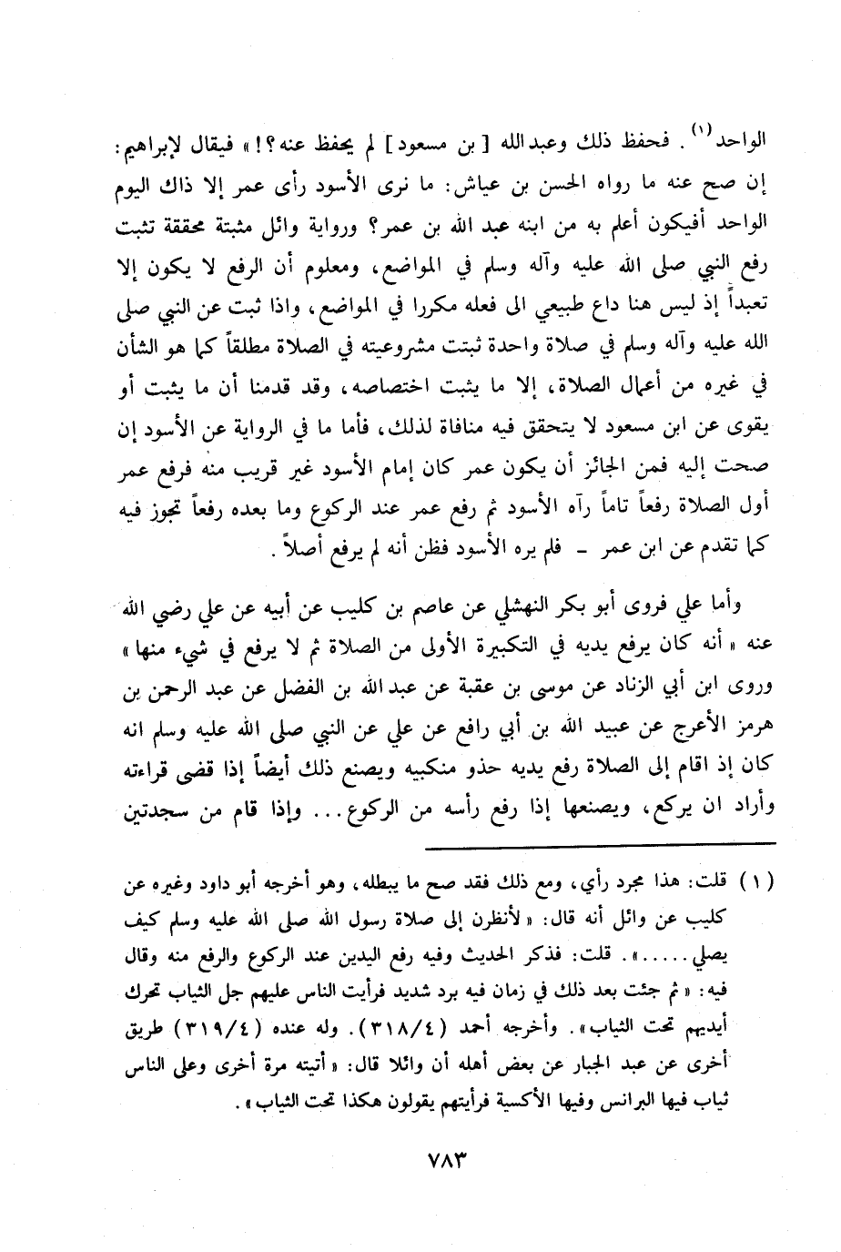 الواحد (1) . فحفظ ذلك وعبد الله «بن مسعود» لم يحفظ عنه؟ !» فيقال لإبراهيم: إن صح عنه ما رواه الحسن بن عياش: ما نرى الأسود رأى عمر إلا ذاك اليوم الواحد أفيكون أعلم به من ابنه عبد الله بن عمر؟ ورواية وائل مثبتة محققة تثبت رفع النبي - صلى الله عليه وسلم - في الواضع، ومعلوم أن الرفع لا يكون إلا تعبداً إذ ليس هنا داع طبيعي إلا فعله مكررا في المواضع، وإذا ثبت عن النبي - صلى الله عليه وسلم - في صلاة واحد ثبتت مشروعيته في الصلاة مطلقاً كما هو الشأن في غيره من أعمال الصلاة، إلا ما يثبت اختصاصه، وقد قدمنا ما يثبت أو يقوى عن أن مسعود لا يتحقق فيه منافاة لذلك، فأما في الرواية عن الأسود إن صحت إليه فمن الجائز أن يكون عمر كان إمام الأسود غير قريب منه فرفع عمر أول الصلاة رفعاً تاماً رآه الأسود ثم رفع عمر عند الركوع وما بعده رفعاً تجوز فيه كما تقدم عن ابن عمر -فلم يره الأسود فظن أنه لم يرفع أصلاً.