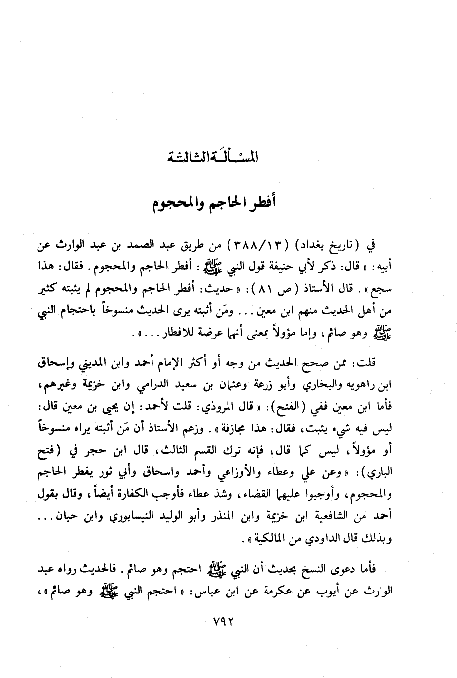 قلت: ممن صحح الحديث من وجه أو أكثر الإمام أحمد وابن المديني وإسحاق بن راهو ية والبخاري وأبو زرعة وعثمان بن سعيد الدارمي وابن خزيمة وغيرهم. فأما ابن معين ففي (الفتح) : قال المروذي: قلت لأحمد: إن يحيى بن معين قال: ليس فيه شيء يثبت. فقال: هذا مجازفة» . وزعم الأستاذ أن من أثبته يراه منسوخاً أو مؤولاً، ليس كما قال، فإنه ترك القسم الثالث، قال ابن حجر في (فتح الباري) : «وعن علي وعطاء والأوزاعي وأحمد وإسحاق وأبي ثور يفطر الحاجم والمحجوم، وأوجبوا عليهما القضاء، وشذ عطاء فأوجب الكفارة أيضاً، وقال بقول أحمد من الشافعية ابن خزيمة وابن المنذر وأبو الوليد النيسابورى وابن حبان ... وبذلك قال الداودي من المالكية» .