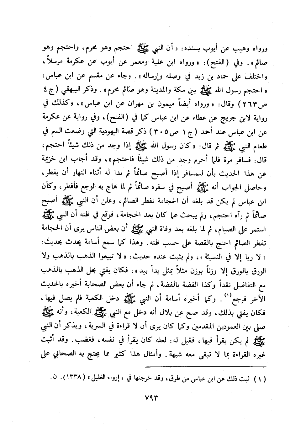 ورواه وهيب عن أيوب بسنده: «أن النبي - صلى الله عليه وسلم - احتجم وهو محرم، واحتجم وهو صائم» . وفي (الفتح) «ورواه ابن علية معمر عن أيوب عن عكرمة مرسلاً، واختلف على حماد بن زيد في وصلة وإرساله» . وجاء عن مقسم عن ابن عباس:: «احتجم رسول الله - صلى الله عليه وسلم - بين مكة والمدينة وهو صائم محرم» . وذكر البيهقي ج4 ص 263 وقال: «وراه أيضاً ميمون بن مهران عن ابن عباس» ، وكذلك في رواية لابن جريج عن عطاء عن ابن عباس كما في (الفتح) عن عكرمة عن ابن عباس عند أحمد ج1 ص305 ذكر قصة اليهودية التي وضعت السم في الطعام النبي - صلى الله عليه وسلم - إذا وجد من ذلك شيئاً احتجم، قال: فسافر مرة فلما أحرم وجد من ذلك شيئاً فاحتجم» . وقد أجاب ابن خزيمة عن هذا الحديث بأن للمسافر إذا أصبح صائماً ثم بدا له أثناء النهار أن يفطر، وحاصل الجواب انه - صلى الله عليه وسلم - أصبح في سفرة صائماً ثم لما هاج به الوجع احتجم فأفطر، وكأن ابن عباس لم يكن قد بلغه أن الحجامة تفطر الصائم احتج بالقصة على حسب ظنه. وهذا كما سمع أسامة يحدث بحديث: «لا ربا إلا في النسيئة» ولم يثبت عنده حديث:
