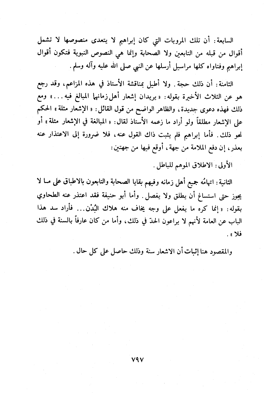 الثامنة: أن ذلك حجة. ولا أطيل بمناقشة الأستاذ في هذه المزاعم، وقد رجع هو عن الثلاث الأخير بقوله: «يريدان إشعار أهل زمانهما المبالغ فيه ... » ومع ذلك فهذه دعوى جديدة، والظاهر الواضح من قول القائل: «الإشعار مثله» الحكم على الإشعار مطلقاً ولوأراد ما زعمه الأستاذ لقال: «لمبالغة في الأشعار مثلة» أو نحو ذلك. فأما إبراهيم فلم يثبت ذاك القول عنه، فلا ضرورة إلى الاعتذار عنه بعذر، إن دفع الملامة من جهة، أو قع فيها من جهتين: