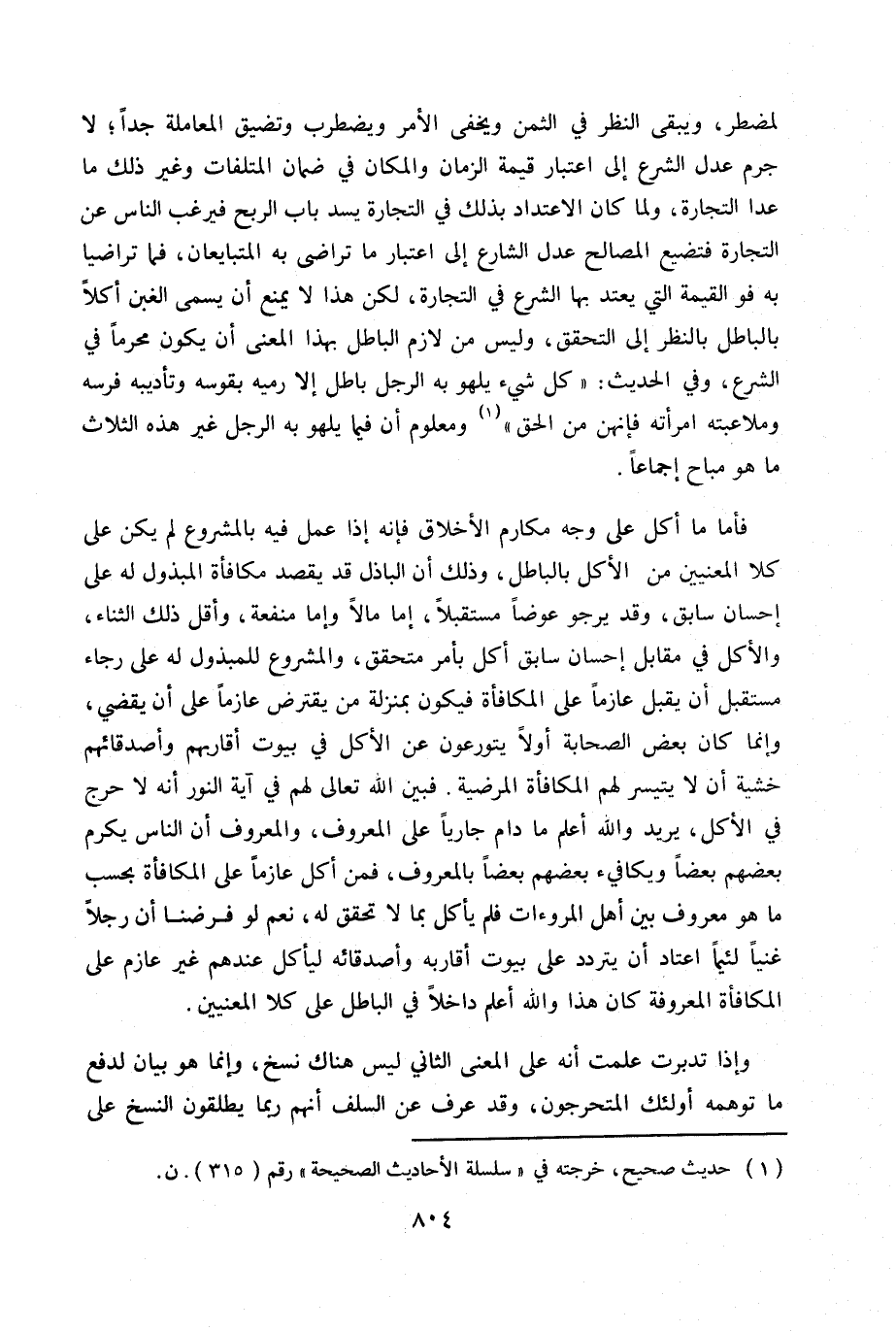 فأما ما أكل على وجه مكارم الأخلاق فإنه إذا عمل فيه بالمشروع لم يكن على كلا المعنيين من الأكل بالباطل، وذلك أن الباذل قد يقصد مكافأة المبذول له على إحسان سابق، وقد يرجوعوضاً مستقبلاً، إما مالاً وإما منفعة، وأقل ذلك الثناء، والأكل في مقابل غحسان سابق أكل بأمر متحقق، والمشروع للمبذول له على رجاء مستقبل أن يقبل عازماً غعلى المكافأة فيكون بمنزله من يفترض عازماً على لأن يقضى، وإنما كان بعض الصحابة أولاً يتورعون عن الأكل في بيوت أقاربهم وأصدقائهم خشية أن لا يتيسر لهم المكافأة المرضية. فبين الله تعالى لهم في آية النور أنه لا حرج في الأكل، يريد والله أعلم مادام ذلك جارياً على المعروف، والمعروف أن الناس يكرم بعضهم بعضا ويكافئ بعضهم بعضا بالمعروف، فمن أكل عازماً على المكافأة بحسب ما هو معروف بين أهل المروءات فلم يأكل بما لا تحقق له، نعم لو فرضنا أن رجلاً غنياً لئيماً اعتاد أن يتردد على بيوت أقاربه وأصدقائه ليأكل عندهم غير عازم على المكافأة المعروفة كان هذا والله أعلم داخلاً في الباطل على كلا المعنيين.