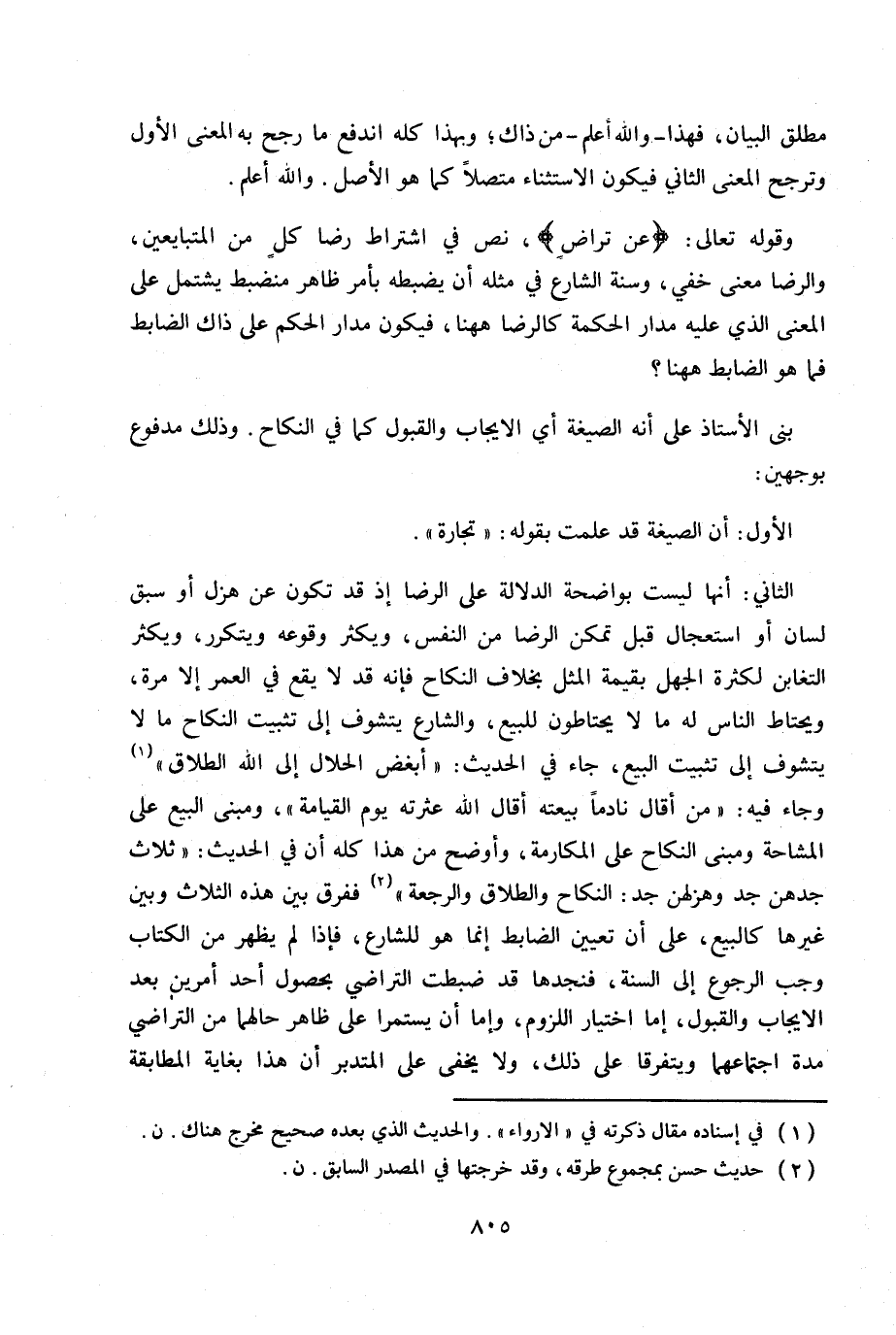 الثاني: أنها ليست بواضحه الدلالة على الرضا إذ تكون عن هزل أو سبق لسان أو استعجال قبل تمكن الرضا من النفس، ويكثر وقوعه ويتكرر، ويكثر التغابن لكثرة الجهل بقيمة المثل بخلاف النكاح فإنه قد لا يقع في العمر إلا مرة، ويحتاط الناس له ما لا يحتاطون للبيع، والشارع يتشوف إلى تثبيت النكاح ما لا يتشوف إلى تثبيت البيع، جاء في الحديث: «أبغض الحلال إلى الله الطلاق (1) » وجاء فيه: «من أقال نادماً بيعته أقال الله عثرته يوم القيامة» ومبنى البيع على المشاحة ومبنى النكاح على مكارمه، وأوضح من هذا كله أن في الحديث: «ثلاث جدهن جد وهزلهن جد: النكاح والطلاق والرجعة (2) ففرق هذا ثلاثة وبين غيرها كالبيع، على أن تعين الضابط غنما هو للشارع، فإذا لم يظهر من الكتاب وجب الرجوع إلى السنة، فنجدها قد تعيين الضابط التراضي بحصول أحد أمرين بعد الإيجاب والقبول، وأما احتيار اللزوم، وأما أن يستمرا على ظاهر حالهما من التراضي مدة اجتماعهما ويتفرقا على ذلك، ولا يخفى على المتدبر أن هذا بغاية المطابقة