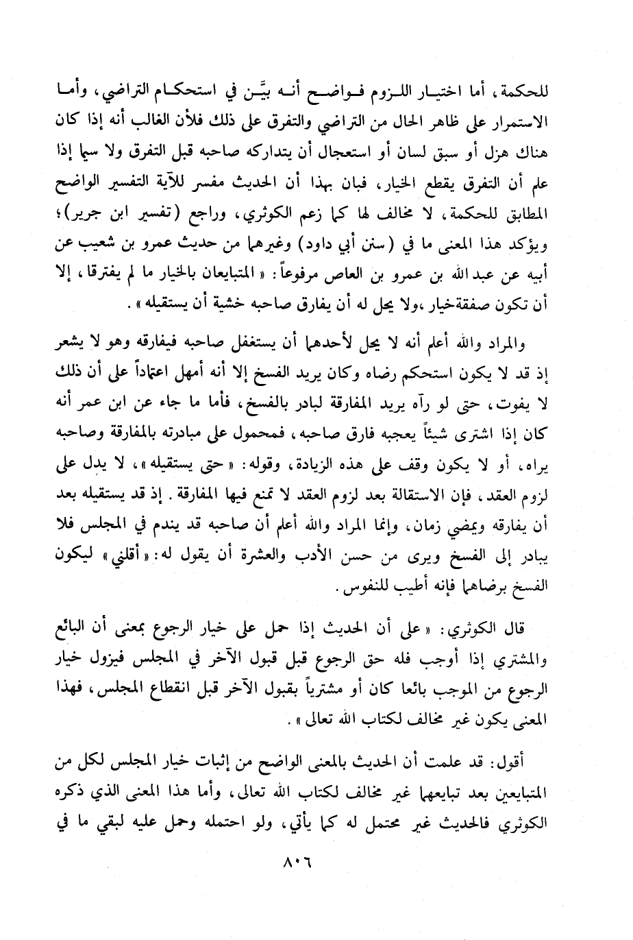 للحكمة، أما اختيار اللزوم فواضح أنه بين في استحكام التراضي، وأما الاستمرار على ظاهر الحال من التراضي والتفرق على ذلك فلأن الغالب أنه إذا كان هناك هزل أو سبق لسان أو استعجال أن يتدار كه صاحبه قبل التفرق ولا سيما إا علم أن التفرق يقطع الخيار. فبان بهذا أن الحديث مفسر للآية التفسير الواضح المطابق للحكمة، لا مخالف لها كما زعم الكوثري، وراجع (تفسير أبن جرير) . ويؤكد هذا المعنى مافي (سنن أبي داود) وغيرهما من حديث عمرو بن شعيب عت أبيه عن عبد الله بن عمرو بن العاص مرفوعاً: «المتبايعان بالخيار ما لم يتفرقا، إلا أن تكون الصفقة خيار ولا يحل له ان يفارق5 صاحبه خشية أن يستقيله» .