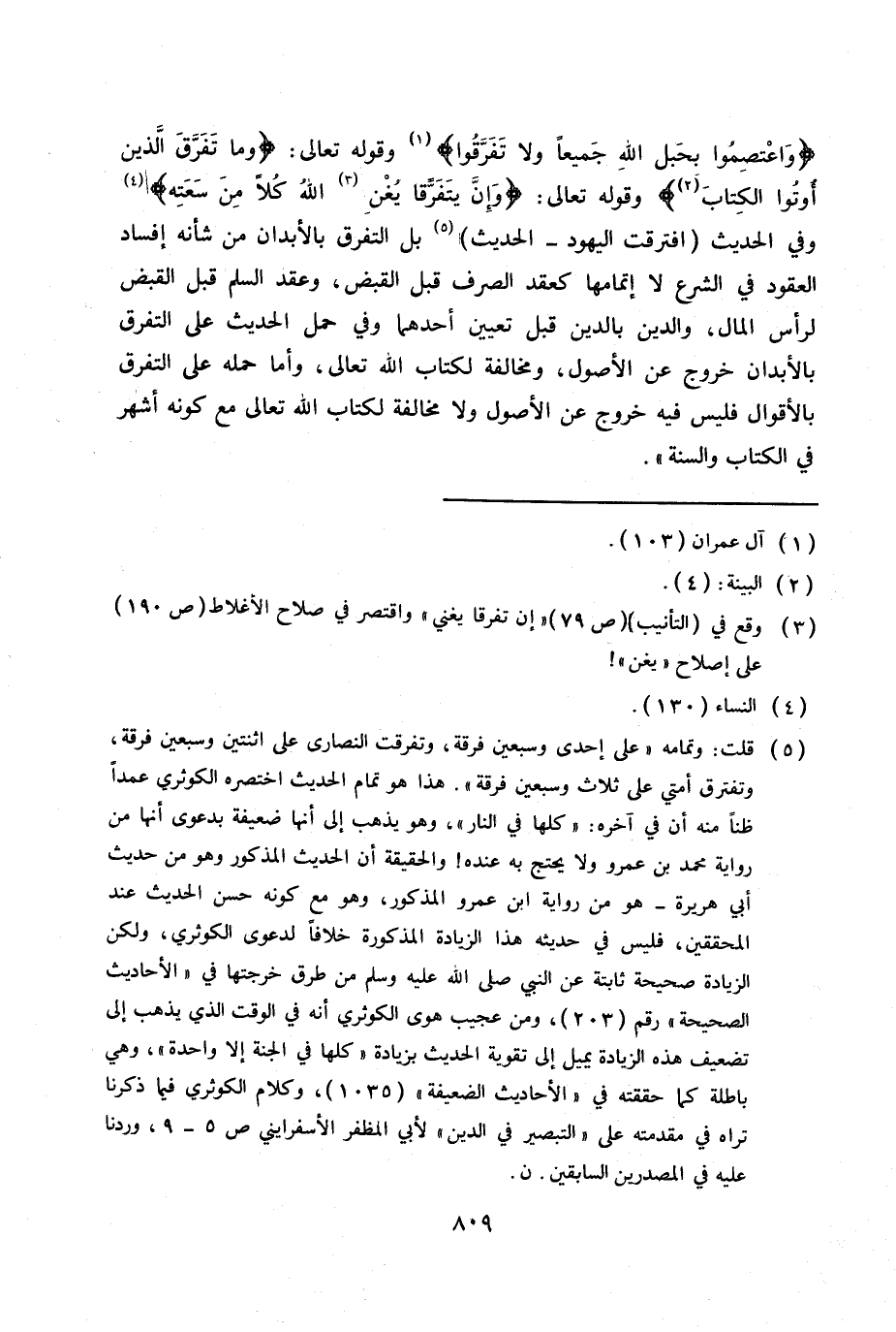 (2) قلت: وتمامة «على إحدى وسبعين فرقة، وتفرقت النصارى علىاثنين وسبعين فرقة، وتفترق امتى على ثلاث وسبعين فرقة» هذا هو تمامن الحديث اختصره الكوثري عمداً ظنا منه في آخر: «كلها في النار» وهو يذهب ضعيفة بدعوى أنها منة ورواية محمد بن عمروولا يحتج به عنده! والحقيقة أن الحديث المذكور وهو من حديث أبي هريرة -هو ابن عمر المذكور، وهو مع كونه حسن الحديث عند المحقيقين، فليس في حديثه هذا الزيادة المذكورة خلافاً لدعوى الكوثري، ولكن الزيادة صحيحة ثابتة عن النبي - صلى الله عليه وسلم - من طرق خرجتها في «الأحاديث الصحيحة» رقم (203) ، ومن عجيب هوى الكوثري أنه في الوقت الذي يذهب إلى تضعيف هذه الزيادة يميل إلى تقوية الحديث بزيادة «كلها في الجنة إلا واحدة» وهي باطلة كما حققته في «الأحاديث الضعيفة» (1035) ، وكلام الكوثري فيما ذكرنا تراه في مقدمته على «التبصير في لدين» لأبي المظفر الأسفرايني ص 5-9، وردنا عليه في المصدرين السابقين. ن
