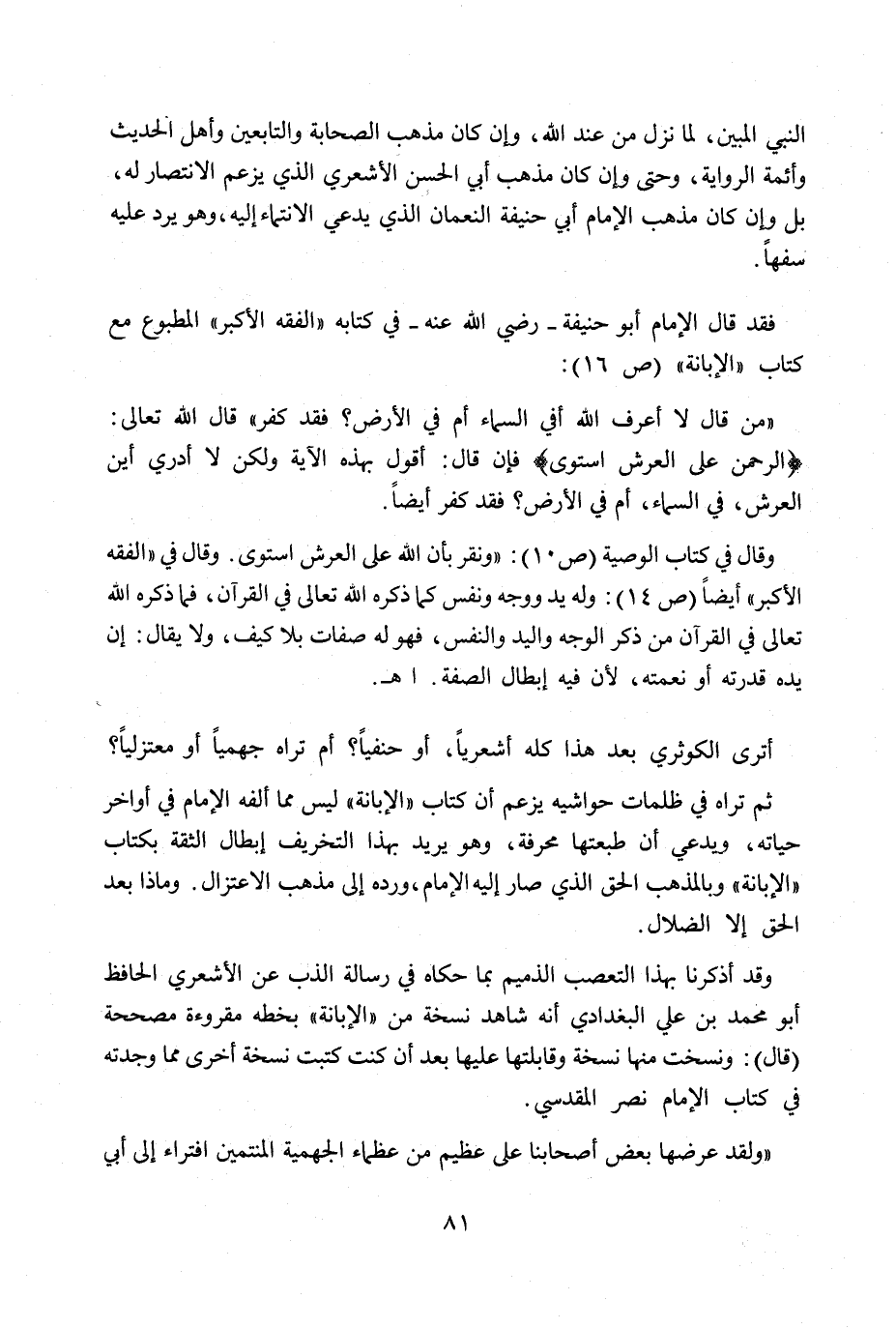 وقال في كتاب الوصية (ص 10) : "ونقر بأن الله على العرش استوى. وقال في "الفقه الأكبر" أيضاً (ص 14) : وله يد ووجه ونفس كما ذكره الله تعالى في القرآن، فما ذكره الله تعالى في القرآن من ذكر الوجه واليد والنفس، فهو له صفات بلا كيف، ولا يقال: إن يده قدرته أو نعمته، لأن فيه إبطال الصفة. اهـ.