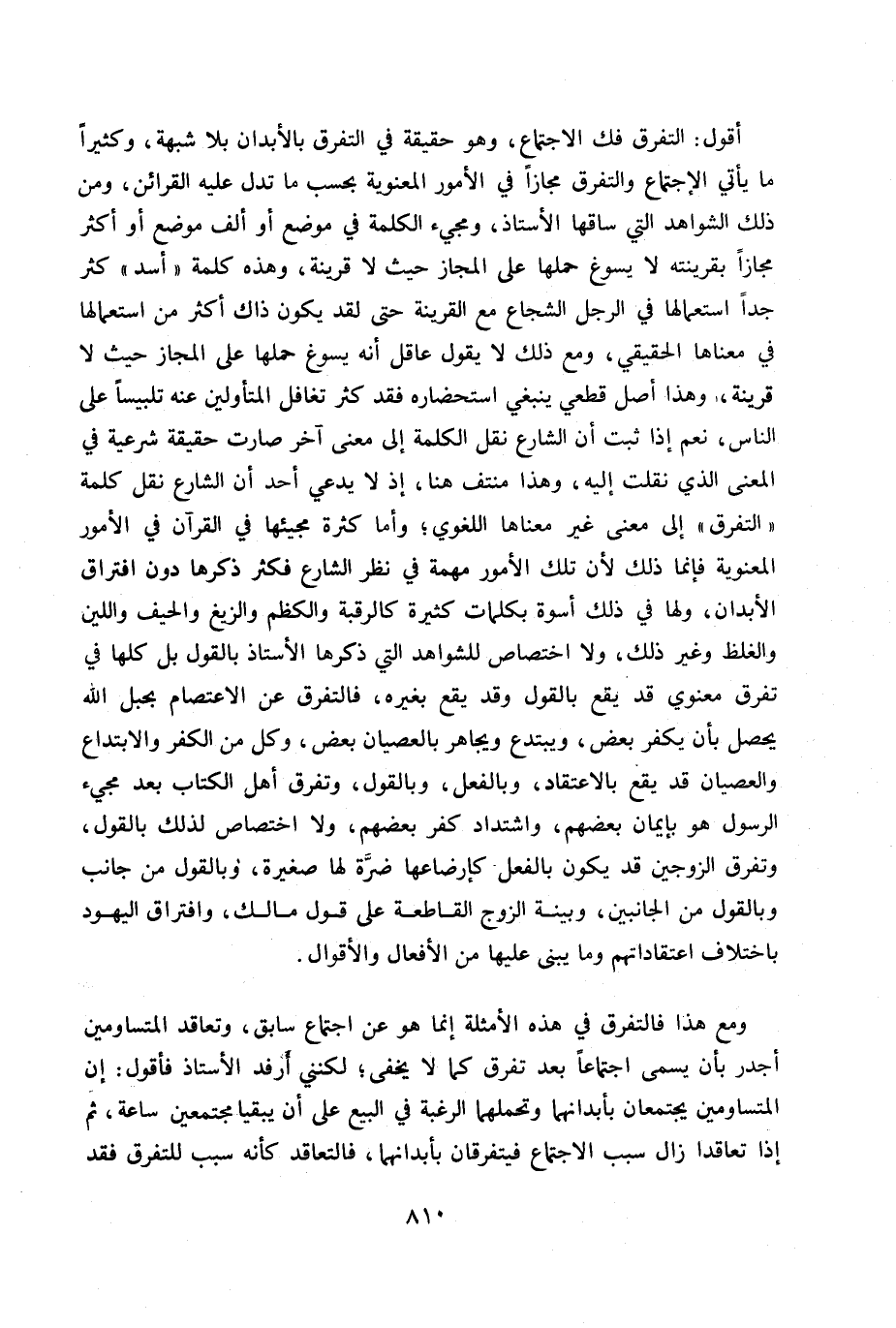 أقول: التفرق فك الاجتماع، وهو حقيقة في التفرق بالأبدان بلا شبهة، وكثيراً ما يأتي الإجتماع والتفرق مجازاً في الأمور المعنوية بحسب ما تدل عليه القرائن، ومن ذلك الشواهد التي ساقها الأستاذ، ومجيء الكلمة في موضع أو أكثر مجازاً بقرينته لا يسوغ حملها على المجاز حيث لا قرينة، وهذه كلمة «أسد» كثر جدا استعمالها في الرجل الشجاع مع القرينة حتى لقد يكون ذلك أكثر من استعمالها في معناها الحقيقي، ومع ذلك لا يقول عاقل أنه يسوغ حملها على المجاز حيث لا قرينة، وهذا أصل قطعي ينبغي استحضاره فقد كثر تغافل المتأو لين عنه تلبيساً على الناس. نعم إذا ثبت ان الشارع نقض الكلمة الى معنى الآخر صارت حقيقة شرعيه في معنى الذي نقلة اليه وهذا هنا، إذ لا يدعي أحد أن الشارع نقض كلمة «التفرق» الى معنى غير معناها اللغوي. وأما كثرة مجيئها في القران في الأمور المعنوية فانما ذلك لأن تلك الامور مهمة في نظر الشارع فكثر ذكرها دون افتراق الابدان، ولها في ذلك اسوة بكلمات كثيرة كرقبه والكظم والزيغ والخيف واللين والغلظ وغير ذلك. ولا اختصاص للشواهد التى ذكرها الأستاذ بالقول بل كلها في تفرق معنوى قد يقع بالقول وقد يقع بغيره، فالتفرق عن الإعتصام بحبل الله يحصل بأن يكفر بعض، ويبتدع ويجاهر بالعصيان بعض، وكل من كفر والابتداع والعصيان قد يقع بالإعتقاد وبالفعل، وبالقول وتفرق اهل الكتاب بعد مجيء الرسول هو بإيمان بعضهم، وإشتداد كفر بعضهم ولا اختصاص لذلك بالقول، وتفرق الزوجين قد يكون بالفعل كارضاعها ضرة لها صغيرة، وبالقول من الجانبين، وبنية الزواج القاطعة على قول مالك، وافتراق اليهود باختلاف اعتقاداتهم وما يبني عليها من الأفعال والأقوال.