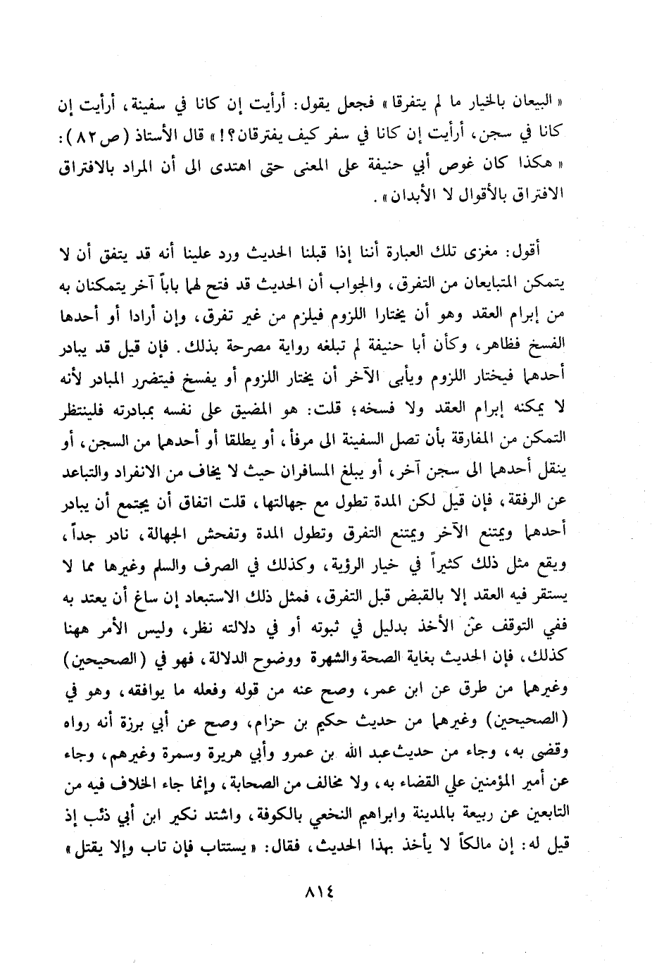قلت: هو المضيق على نفسه بمبادرته فلينتظر التمكن من المفارقة بأن تصل السفينة إلى مرفأ، أو يطلقا أو أحدهما من السجن، أو ينقل أحدهما إلى سجن آخر، أو يبلغ المسافران حيث لا يخاف من الانفراد والتباعد عن الرفقة. فإن قيل لكن المدة قد تطول مع جهالتها. قلت اتفاق أن يجتمع أن يبادر أحدهما ويمتنع التفرق وتطول المدة وتفحش الجهالة، نادر جداً، ويقع مثل ذلك كثيراً في خيار الرؤية، وكذلك في الصرف والسلم وغيرها مما لا يستقر فيه العقد إلا بالقبض قبل التفرق، فمثل ذلك الاستبعاد إن ساغ أن يعتد به ففى التوفيق عن الأخذ بدليل في ثبوته أو في دلالته نظر، وليس الأمر ههنا كذلك، فإن الحديث بغاية الصحة والشهرة ووضوح الدلالة، فهو في (الصحيحين) وغيرهما من طرق عن ابن عمر، وصح عنه من قوله وفعله ما يوافقه، وهو في (الصحيحين) غيرهما من حديث حكيم بن حزام، وصح عن أبي برزة أنه رواه وقضى به، جاء من حديث عبد الله بن عمر وأبي هريرة وسمرة ةغيرهم، وجاء عن أمير المؤمنين على القضاء به، ولا مخالف من الصحابة، وإنما جاء الخلاف فيه من التابعين عن ربيعة بالمدينة وإبراهيم النخعي بالكوفة، واشتد نكير ابن أبي ذئب إذ قيل له: إن مالكاً لا يأخذ بهذا الحديث، فقال: «يستتاب فإن تاب وإلا يقتل»