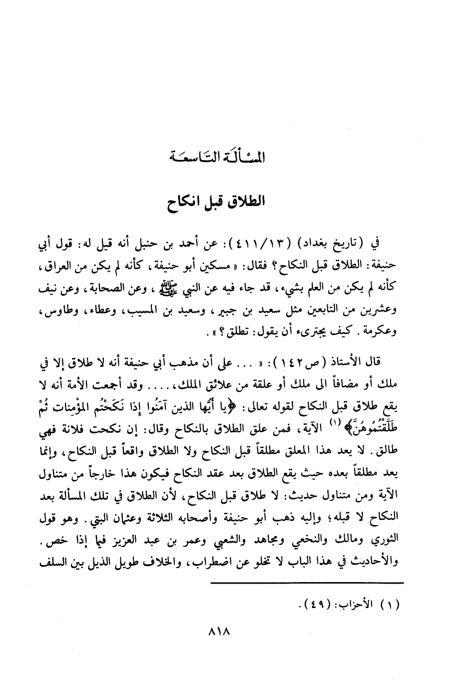 في (تاريخ بغداد) 13/411: عن أحمد بن حنبل أنه قيل له: قول أبي حنيفة: الطلاق قبل النكاح؟ فقال: «مسكين أبو حنيفة، كأنه لم يكن من العراق، وكأنه لم يكن من العلم بشيء، قد جاء فيه عن النبي - صلى الله عليه وسلم - وعن الصحابة، وعن نيف وعشرين من التابعين مثل سعيد بن جبير، وسعيد بن المسيب، عطاء، وطاوس، وعكرمة كيف يجترى أن يقول: تطلق؟» .