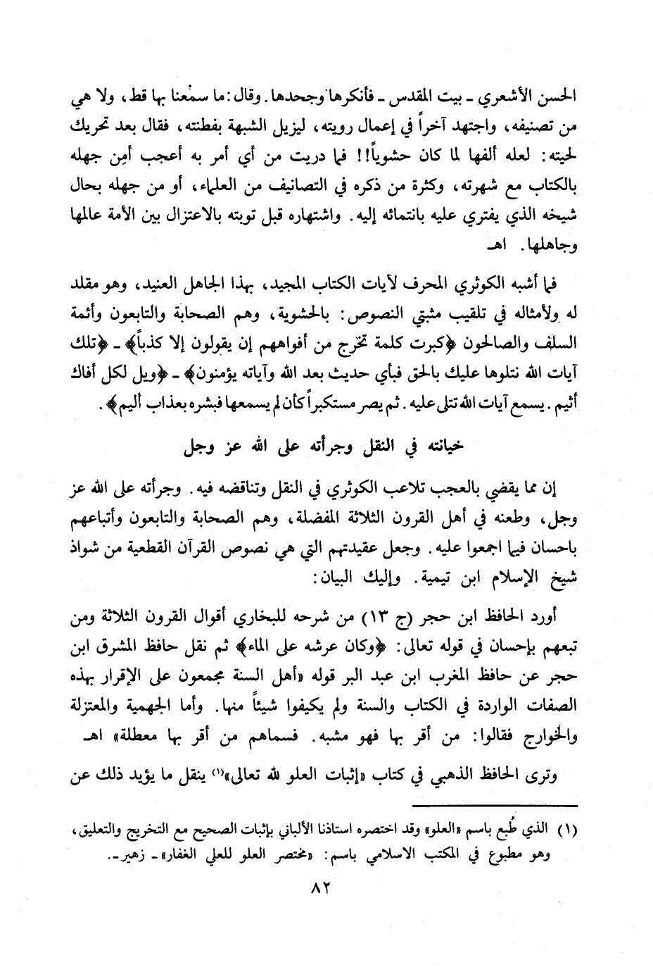 فما أشبه الكوثري المحرف لآيات الكتاب المجيد، بهذا الجاهل العنيد، وهو مقلد له ولأمثاله في تلقيب مثبتي النصوص: بالحشوية، وهم الصحابة والتابعون وأئمة السلف والصالحون "كَبُرَتْ كَلِمَةً تَخْرُجُ مِنْ أَفْوَاهِهِمْ إِنْ يَقُولُونَ إِلَّا كَذِبًا" " تِلْكَ