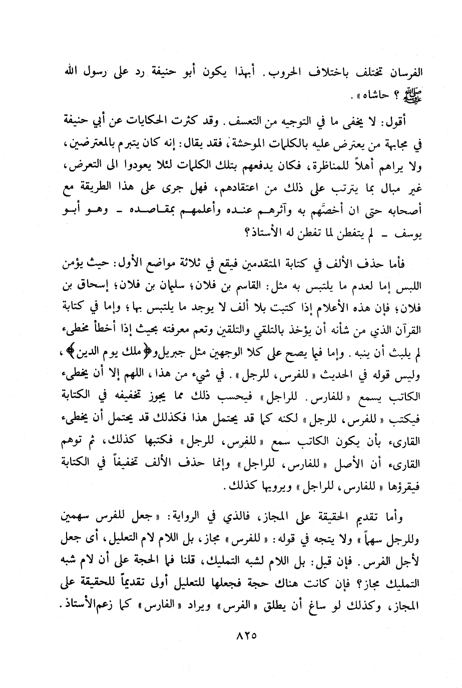 وأما تقديم الحقيقة على المجاز، فالذي في الرواية «جعل للفرس همين وللرجل سهماً» ولا يتجه في قوله: «للفرس» مجاز، بل اللام لام التعليل، أي جعل لأجل الفرس. فغن قيل: بل اللام لشبه التمليك، قلنا فما الحجة على أن لام شبه التمليك مجاز؟ فإن كانت هناك حجة فجعلهاللتعليل اولى تقديماً للحقيقة على المجاز وكذلك لوساغ أن يطلق «الفرس» ويراد «الفارس» كما زعم الأستاذ.