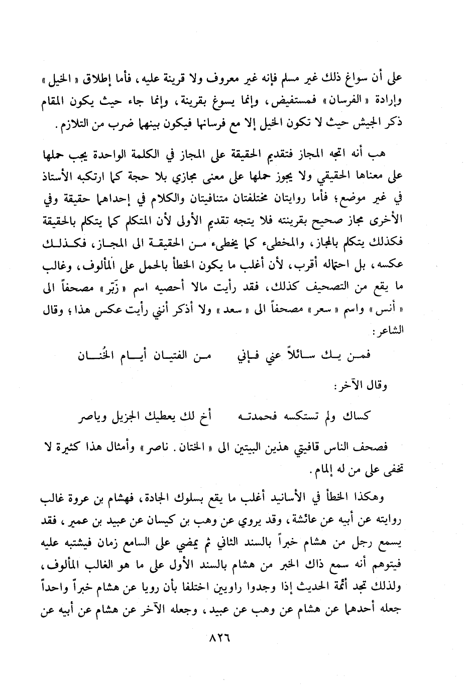 هب أنه اتجه المجداز فتقدم علىالمجاز محله في الكلمة الواحدة يجب حملها على معناها الحقيقي ولا يجوز حملها علىمعنى مجازى بلاحجة كما ارتبكه الأستاذ في غير موضوع. فأما روايتان مختلفتان متنافيتان والكلام في إحد اهما حقيقة وفي الأخرى مجاز صحيح بقرينته فلا يتجه تقديم الأولى للان المتكلم كما يتكلم بالحقيقة فكذلك يتكلم بالمجاز، والمخطئ كما يخطئ من الحقيقة إلى المجاز، فكذلك عكسه، بل احتمله أقرب، لأن أغلب ما يكون الخطأ بالحمل على المألوف، وغالب كا يقع من التصحيف كذلك، فقد رأيت مالا أحصيه اسم «زَبر» مصحفاً إلى «أنس» واسم «سعر» مصحفاً إلى «سعد» ولا أذكر أننى رأيت عكس هذا. قال الشاعر: