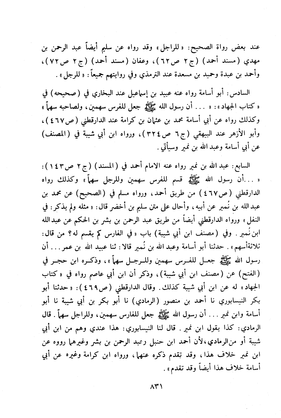 السابع: عبد الله بن نمير رواه عنه الإمام أحمد في (المسند) ج 2 ص143: « ... أن رسول الله - صلى الله عليه وسلم - قسم للفرس سهمين وللرجل سهما» وكذلك رواه الدارقطني ص467 من طريق أحمد، رواه مسلم في (الصحيح) عن محمد بن نمير عن أبيه، وأحال على متن سليم بن أخضر قال: «مثله ولم يذكر: في النفل» ورواه الدارقطني أيضاً من طريق عبد الرحمن بن بشير بن الحكم عن عبد الله بن نمير. وفي (مصنف أبن أبي شيبة) باب «في الفارس كم يقسم له؟ من قال: ثلاثة أسهم» . حدثنا أبو أسامة وعبد الله بن نمير قالا: ثنا عبيد الله بن عمر ... أن رسول ألله - صلى الله عليه وسلم - جعل للفرس سهمين وللرجل سهماً» وذكره ابن حجر في (الفتح) عن (مصنف ابن أبي شيبة) وذكر أن أبي عاصم رواه في «كتاب الجهاد» له عن ابن أبي شيبة كذلك. وقال الدارقطني ص 469: «حدثنا أبو بكر النيسابوري نا أحمد بن منصور (الرمادي) نا أبو بكر بن أبي شيبة نا أبو أسامة وابن زيد نمير ... أن الرسول الله - صلى الله عليه وسلم - جعل للفارس سهمين , وللراجل سهماً. قال