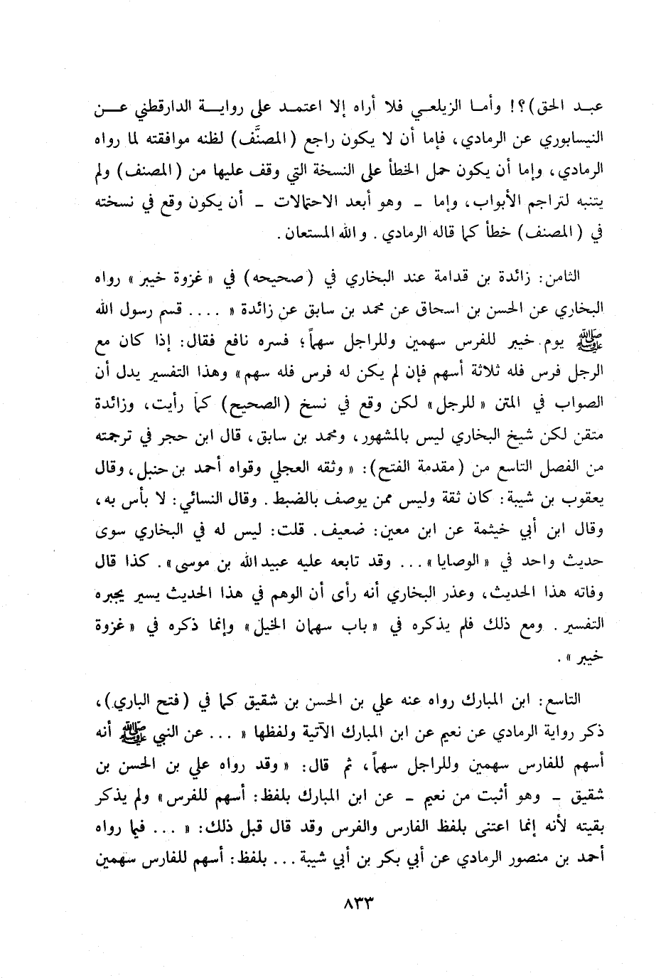 التاسع: ابن المبارك رواه عته علي بن الحسن بن شقيق كما في (فتح الباري) ، ذكر روايوالرمادي عن نعيم عن ابن المبارك الآيتة ولفظها « ... عن النبي - صلى الله عليه وسلم - أنه اسهم للفارس سهممين وللرجل سهماًَ، ثم قال: «وقدجرواه على ابن الحسن ابن شقيق - هو أثبت من نعيم - عن ابن المبارك بلفظ: أسهم للفرس» ولم يذكره بقية لأنه إنما اعتنى بلفظ الفارس والفرس وقد قال قبل ذلك: « ... فيما رواه أحمد ابن منصور الرمادي عن أبي بكر بن أبي شيبة ... بلفظ: أسهم للفارس سهمين
