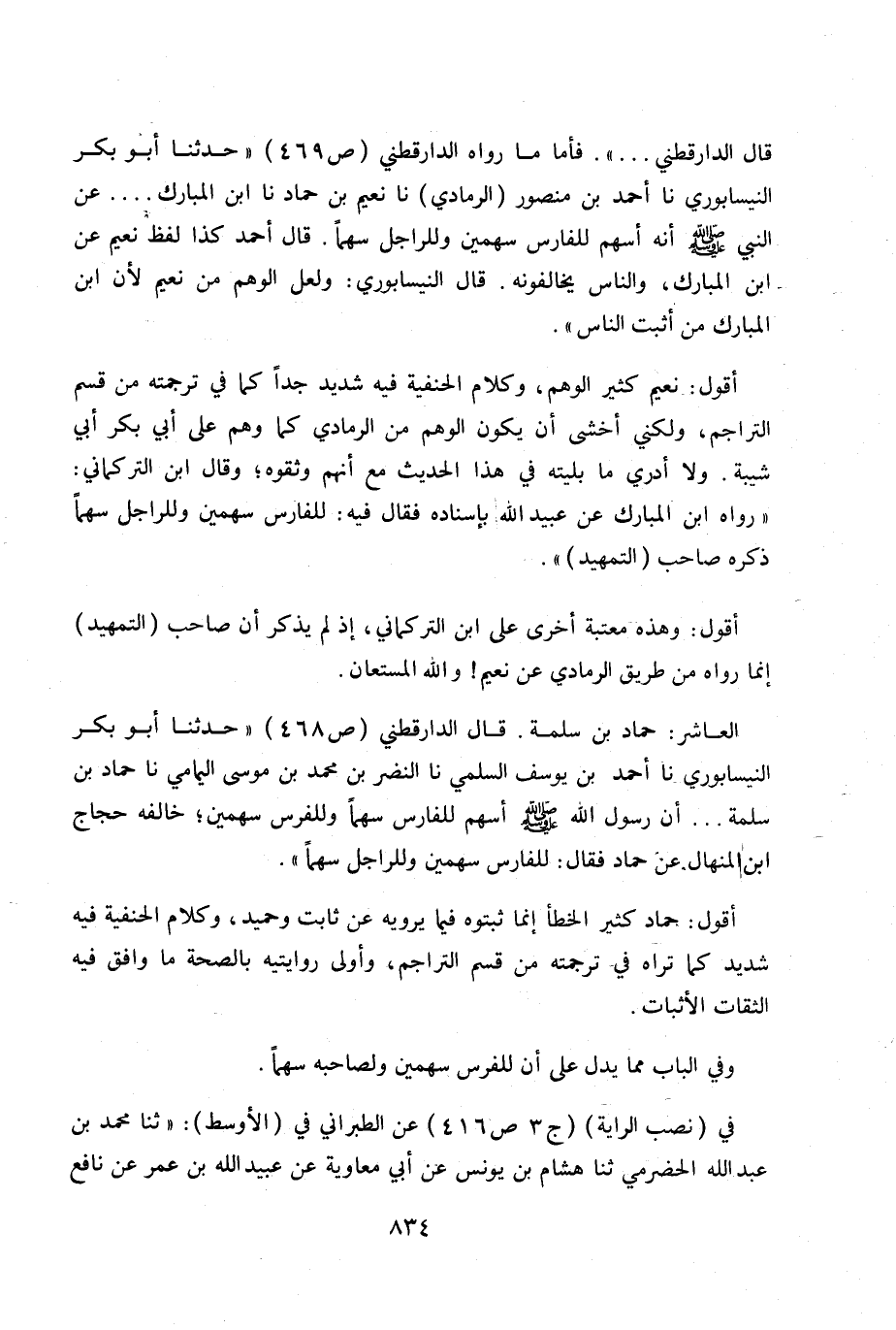 قال الدارقطني ... » . فأما ما رواه الدارقطني ص 469 «حدثنا أبو بكر النيسابوري نا أحمد بن منصور (الرمادي) نا نعيم بن حماد نا ابن المبارك ... عن النبي - صلى الله عليه وسلم - أنه أسهم للفارس سهمين وللرجل سهماً. قال أحمد كذا لفظ نعيم عن ابن المبارك، والناس يخالفونه. قال النيسابوري: ولعل الوهم من نعيم لان ابن المبارك من اثبت الناس» .