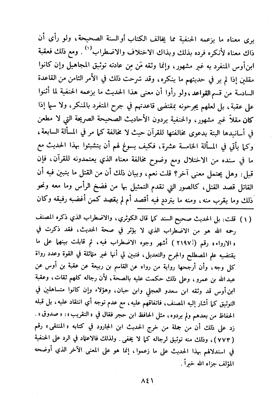 (1) قلت: بل الحديث صحيح السند كما قال الكوثري، والاضطراب الذي ذكره المصنف رحمه الله هو من الاضطراب الذي لا يؤثر في صحة الحديث، فقد ذكرت في «الارواء» رقم (2259) أشهر وجوه الاضطراب فيه، ثم قابلت بينها على ما يقتضيه علم المصطلح والجرح والتعديل، فتبين لي أنها غير متماثلة في القوة وعدد رواة كل وجه، وأن أرجحها رواية من رواه عن القاسم بن ربيعة عن عقبة بن أو س عن عبد الله بن عمرو، وعلى ذلك حكمت عليه بالصحة، لأن رجاله كلهم ثقات، وعقبة بن أو س قد وثقه ابن سعدوالعجلي وابن حبان، وهؤلاء وإن كانوا متساهلين في التوثيق كما أشار إليه المصنف، فاتفاقهم عليه، مع عدم توجه أي انتقاد عليه، بل قبله الحفاظ من بعدهم ولم يردوه، مثل الحافظ ابن حجر فقال في «التقريب» : «صدوق» . زد على ذلك أن من جملة من خرج الحديث ابن الجارود في كتابه «المنتقى» رقم (773) ، وذلك منه توثيق لرجاله كما لا يخفى. ولذلك فالاعتماد في الرد على الحنفية في استدلا لهم بهذا الحديث على ما زعموا، إنما هو على المعنى الآخر الذي أوضحه المؤلف جزاه الله خيراً.