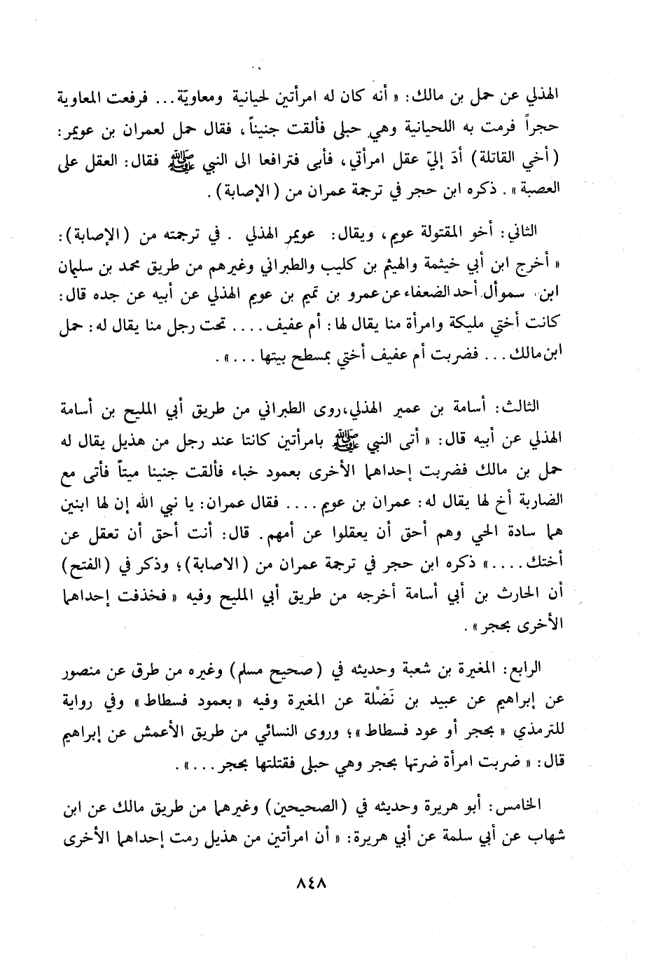 الثالث: أسامة بن عمير الهذلي روى الطبراني من طريق أبي المليح بن أسامة الهذلي عن أبيه قال: «أتى النبي - صلى الله عليه وسلم - بامرأتين كانتا عند رجل من هذيل يقال له: عمران بن عويم ... فقال عمران: يا نبي الله إن لها ابنين هما سادة الحي وهم أحق أن يعقلوا عن أمهم. قال: أنت أحق أن تعقل عن أختك ... » ذكره ابن حجر في ترجمة عمران من (الإصابة) وذكر في (الفتح) أن الحارث بن أبي أسامة أخرجه من طريق أبي المليح وفيه «فخذفت إحداهما الأخرى بحجر» .