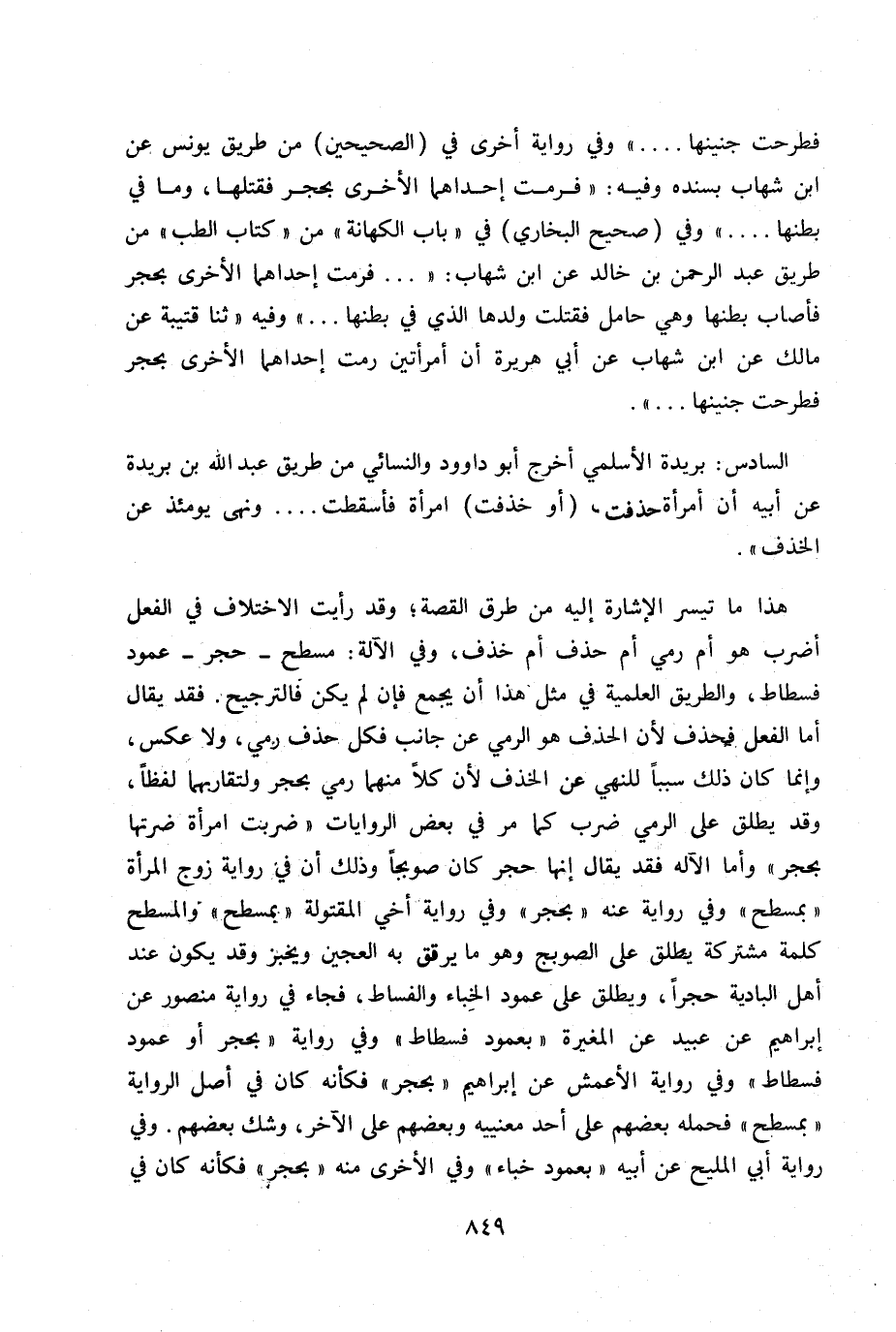 هذا ماتيسر الإشارة إليه من طريق القصة، وقد رأيت الاختلاف في الفعل أضرب هو أم رمي أم حذف أم حذف. وفي الآلة: مسطح -حجر- عمود فسطاط. والطريق العلمية في مثل هذا أن يجمع فإن لم يمكن فالترجيح. فقد بقال أما الفعل فحذف لأن الحذف هو الرمي عن جانب فكل حذف رمي، ولا عكس، وإنما كان ذلك سبباً للنهي عن الحذف لأن كلاً منهما رمي بحجر ولتقاربهما لفظاً. وقد يطلق على الرمي ضرب كما مر في بعض الروايات «ضربت امراة ضربتها بحجر» أما الآلة فقد يقال إنها حجر كان صوبجاً وذلك أن في رواية زوج المراة «بمسطح» وفي رواية عنه «بحجر» وفي رواية أخي المفتولة «بمسطح» والمسطح كلمة مشتركة يطلق على الصوبيج وهو ما يرقق به العجين ويخبز وقد يكون عند أهل البادية حجراً، ويطلق على عمود الخباء والفساط، فجاء في رواية منصور عن إبراهيم عن عبيدة عن المغيرة «بعمود فسطاط» وفي رواية «بحجر أو عمود فسطاط» وفي رواية الأعمش عن ابراهيم «بحجر» فكأنه كان في أصل الرواية «بمسطح» . فحمله بعضهم على احد معنييه وبعضهم على الآخر، وشك بعضهم. وفي رواية أبي المليح عن أبيه «بعمود خباء» وفي الأخرى منه «بحجر» فكأنه كان في