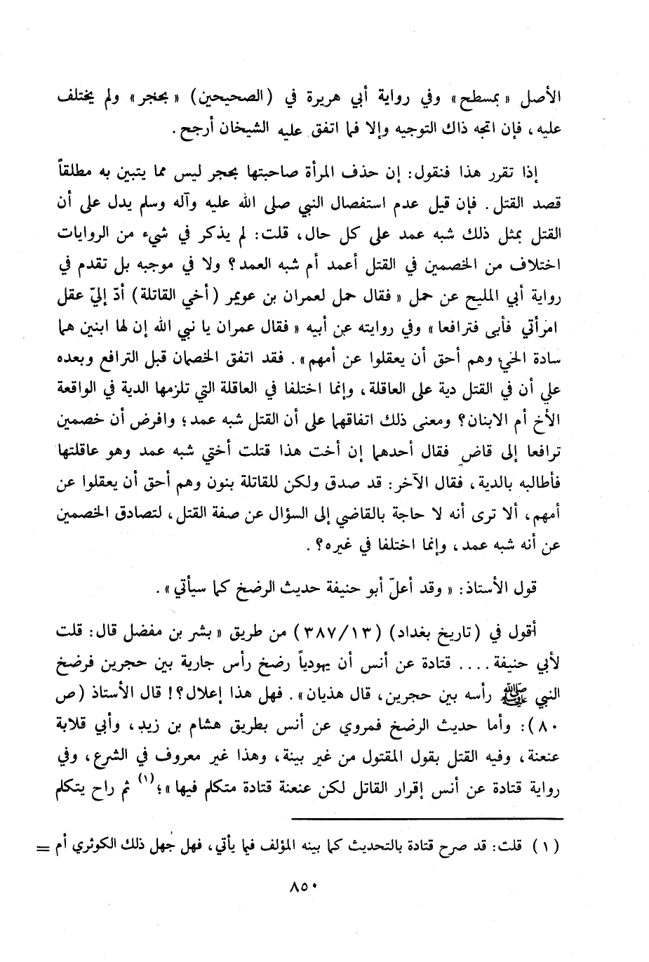 أقول في (تاريخ بغداد) 13/387 من طريق «بشر بن مفضل قال: قلت لأبي حنيفة ... قتادة عن أنس أن يهودياً رضخ رأس جارية بين حجرين فرضخ النبي - صلى الله عليه وسلم - رأسه بين حجرين. قال هذيان» . فهل هذا إعلال؟ ! قال الأستاذ ص 80: وأما حديث الرضخ فمروي عن أنس بطرلايق هشام بن زيد، وأبي قلابة عنعنة، وفيه القتل بقول المقتول من غير بينة، وهذا غير معروف في الشرع، وفي رواية قتادة عن أنس إقرار القاتل لكن عنعنة قتادة متكلم فيها (1) . ثم راح يتكلم