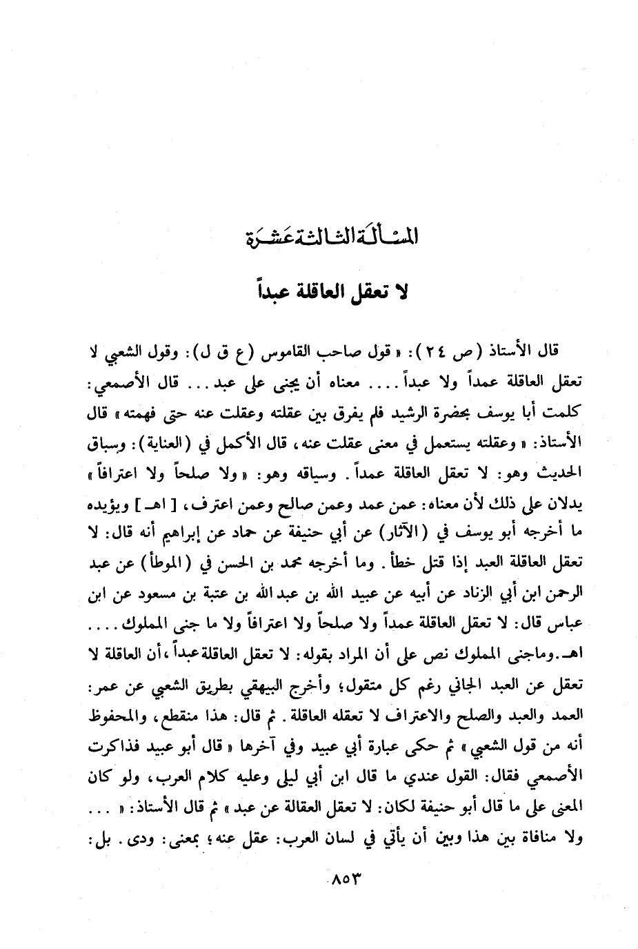قال الأستاذ ص 24: «قول صاحب القاموس (ع ق ل) : وقول الشعبي لا تعقل العاقلة عمداً ولا عبداً ... معناه أن يجني على عبد ... قال الأصمعي: كامت أبا يوسف بحضرة الرشيد فلم يفرق بين عقلته وعقلت عنه حتى فهمته» قال الأستاذ: «وعقلته يستعمل في معنى غقلت عنه، قال الأكمل في (العناية) : وسباق الحديث وهو: لا تعقل العاقلة عمداً. وسياقه وهو: «ولا صلحاً ولا اعترافاً» يدلان على ذلك لأن معناه: عمن عمد وعمن اعترف اه ويؤيده ما أخرجه أبو يوسف في (الآثار) عن أبي حنيفة عن حماد بن غبراهيم أنه قال: لا تعقل العاقلة العبد إذا قتل خطأ. وما أخرجه محمد بن الحسن في (الموطأ) عن عبد الرحمن بقن أبي الزناد عن أبيه عن عبيد الله بن عبد اله بن عتبة بن مسعود عن أبن عباس قال: لا تعقل العاقلة عمداً ولا صلحا ولا أعترافاً ولا ما جنى المملوك ... اه وما جنى المملوك نص على أن المراد بقوله: لا تعقل العاقلة عبداً أن العاقلة لا تعقل عن العبد الجاني رغم كل متقول. وأخرج البيهقي بطريق الشعبي عن عمر: العمد والعبد والصلح والاعتراف لا تعقله العاقلة. ثم قال: هذا منقطع، والمحفوظ أنه من قول الشعبي» ثم حكى عبارة أبي عبيد وفي آخرها «قال أبو عبيد فذا كرت الأصمعي فقال: القول عندي ما قال ابن أبي ليلى وعليه كلام عرب، ولو كان المعنى على ما قال أبو حنيفة لكان: لا تعقل العاقلة عن عبد» ثم قال الأستاذ: « ... ولا منافاة بين هذا وبين أن يأتي في لسان العرب: عقل عنه. بمعنى: ودى. بل: