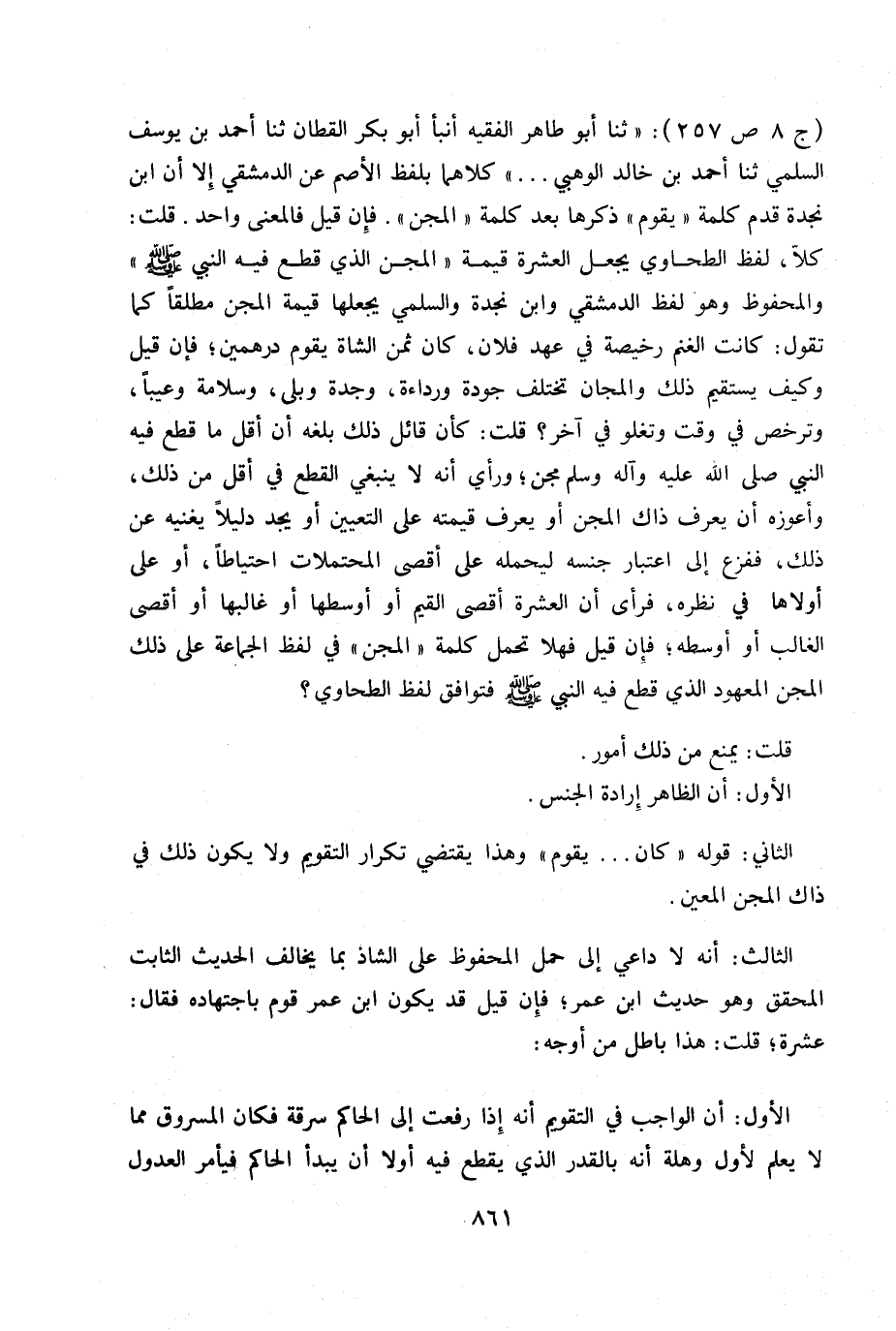 فيه النبي - صلى الله عليه وسلم -» والمحفوظ وهو لفظ الدمشقي وأبن نجدة والسلمي يجعلها قيمة المجن مطلقاً كما تقوم: كانت الغنم رخيصة في عهد فلان، كان ثمن الشاة يقوم درهمين. فإن قيل وكيف يستقيم ذلك والمجان تختلف جودة ورداءة، وجدة وبلى، وسلامة وعيباً، وترخص في وقت وتغلوفي آخر؟ قلت: كأن قائل ذلك بلغه أن أقل ما قطع فيه النبي - صلى الله عليه وسلم - مجن ورأى أنه لا ينبغي القطع في أقل من ذلك، وأعوزه أن يعرف ذاك المجن أو يعرف قيمته على التعين أو يجد دليلاً يغنيه عن ذلك، ففزع إلى اعتبار جنسه ليحمله على أقصى المحتملات احتياطاً، أو على أولاها في نظره، فرأى أن العشرة أقصى القيم أو أو سطها أو غالبها أو أقصى الغالب أو أو سطه. فإن قيل فهلا تحمل كلمة «المجن» في لفظ الجماعة على ذلك المجن المعهود الذي قطع فيه النبي - صلى الله عليه وسلم - فتوافق لفظ الطحاوي؟ قلت: يمنع من ذلك أمور.