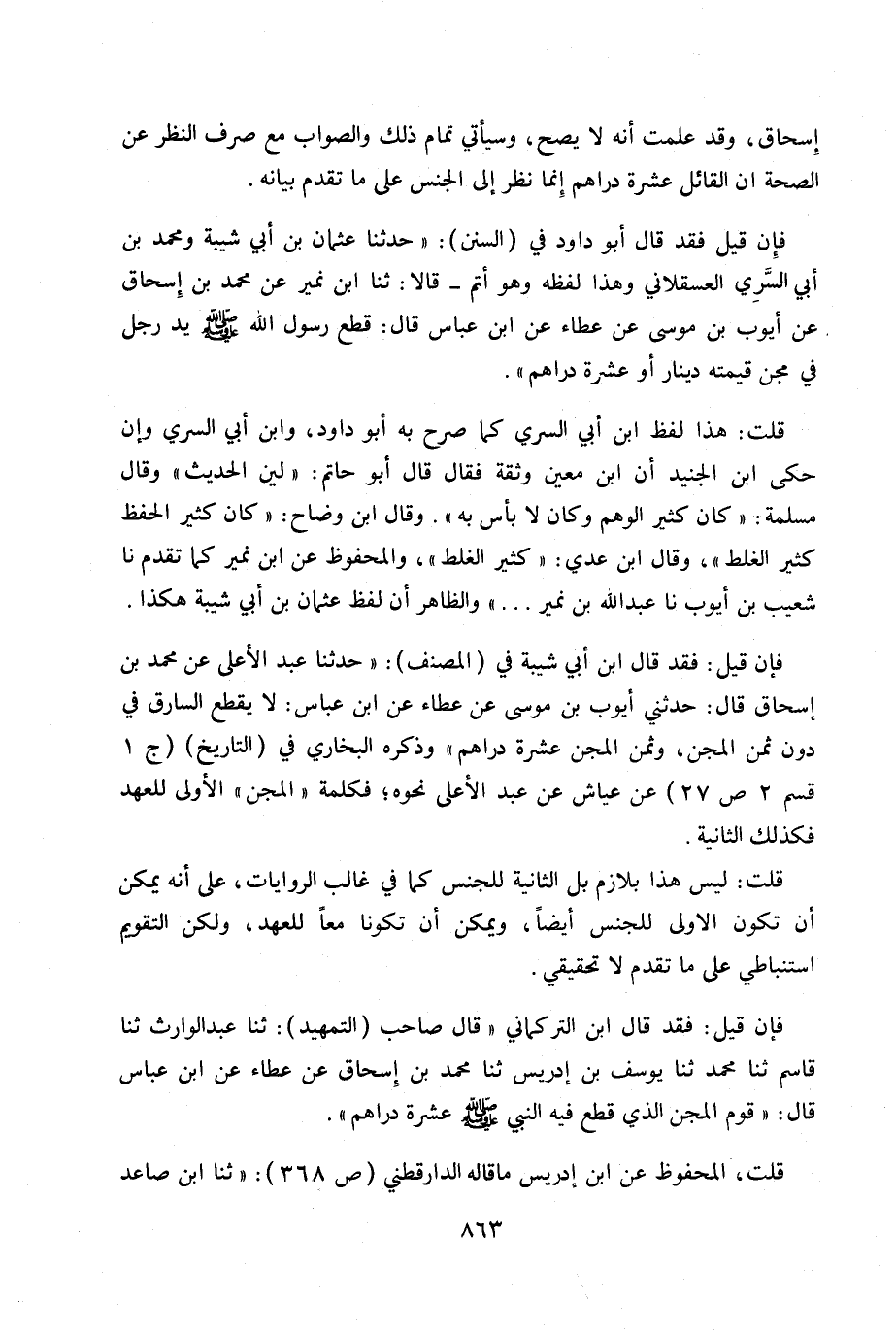 فإن قيل: فقد قال ابن أبي شيبة في (المصنف 9: «حدثنا عبد الأعلى عن محمد عن محمد بن إسحاق قال: حدثني أيوب بن موسى عن عطاء عن ابن عباس: لا يقطع السارق في دون ثمن المجن، وثمن المجن عشرة دراهم» وذكره البخاري في (التاريخ) ج1 قسم 2 ص 27 عن عياش عن عبد الأعلى نحوه. فكلمة «المجن» الأولى للعهد فكذلك الثانية.