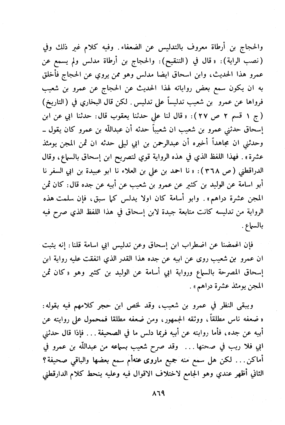 والحجاج بن أرطاة معروف بالتدليس عن الضعفاء وفيه كلام غير ذلك وفي (نصب الراية) : «قال في (التنقيح) : والحجاج بن أرطاة مدلس ولم يسمع من عمروهذا الحديث» . وابن إسحاق أيضاً مدلس وهو ممن يروي عن الحجاج فأخلق به أن يكون سمع بعض رواياته لهذا الحديث عن الحجاج عن عمرو بن شعيب فرواها عن عمروابن شعيب تدليساً عل تدليس. لكن قال البخاري في (التاريخ) ج1 قسم 2 ص27 «قال لنا على حدثنا يعقوب قال: حدثنا أبي عن أبن إسحاق حدثني عمرو بن شعيب أن شعيباً حدثه أن عبد