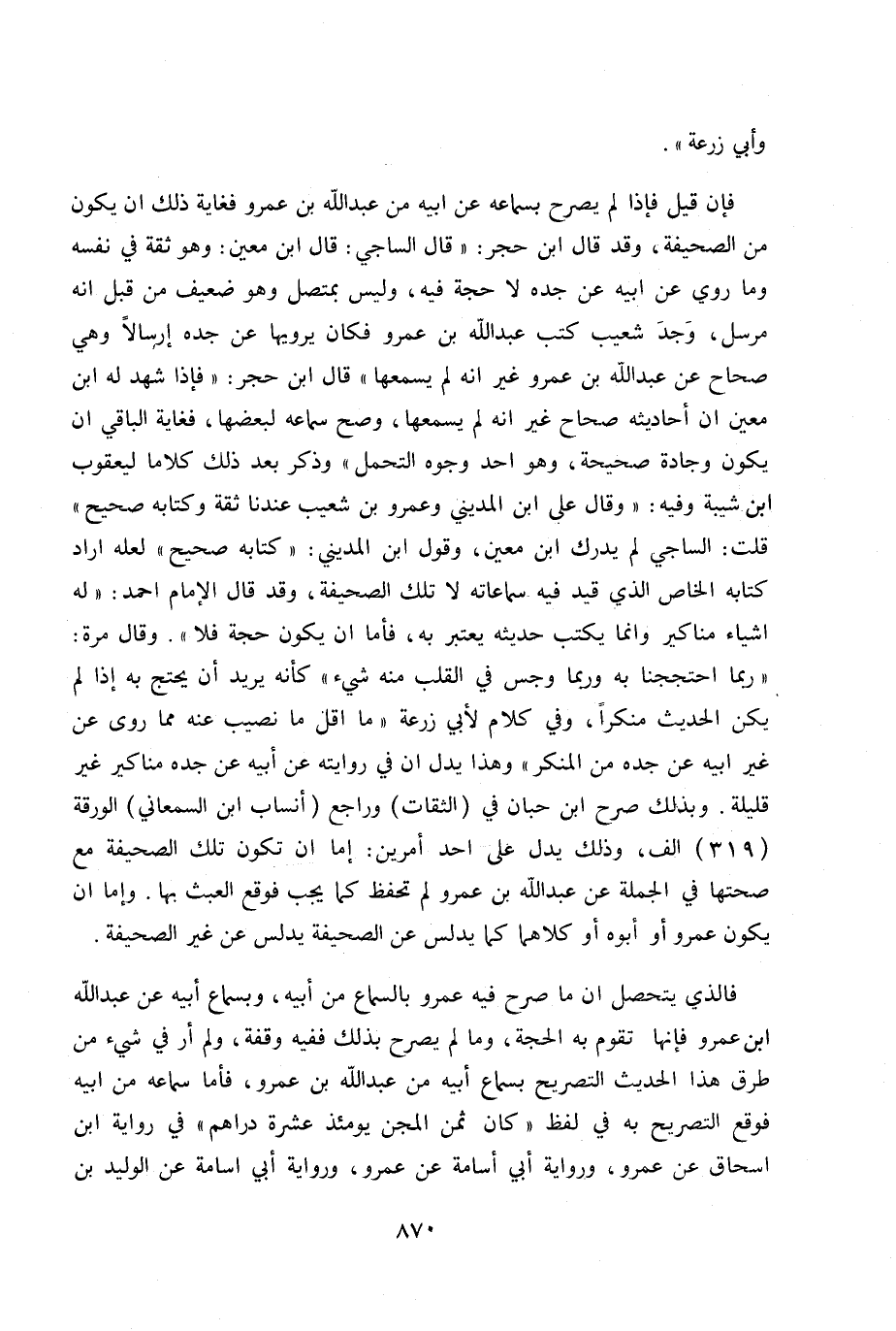 فإن قيل فإذا لم يصرح بسماعه من أبيه من عبد الله بن عمروفغاية ذلك ان يكون من الصحيفة، وقد قال ابن حجر: «قال الساجي: قال ابن معين: هو ثقة في نفسه وما روي عن أبيه عن جده لا حجة فيه، وليس بمتصل وهو ضعيف من قبل انه مرسل، وجد شعيب كتب عبد الله بن أبي عمروفكان يرويها عم جده إرسالاً وهي صحاح عن عبد الله بن عمروغير أنه لم يسمعها» قال ابن حجر: «فإذا شهد له ابن معين ان أحاديثه صحاح غير أنه لم يسمعها، وصح سماعه لبعضها، فغاية الباقي ان يكون وجادة صحيحة، وهو أحد وجوه التحمل» وذكر بعد ذلك كلاماً ليعقوب بن شيبة وفيه: «وقال علي ابن المديني وعمرو بن شعيب عندنا ثقة وكتابة صحيح» قلت: الساجي لم يدرك ابن معين، وقول ابن المديني: «كتابه صحيح» لعله أراد كتابه الخاص الذي قيد فيه سماعاته لا تلك الصحيفة، وقد قال الامام أحمد: «له أشياء مناكير وإنما يكتب حديثه يعتبر به، فأما أن يكون حجة فلا» . وقال مرة: «ربما احججنا به وربما وجس في القلب منه شيء» مأنه يريد أن يحتج به إذا لم يكن الحديث منكراً، وفي كلام أبي زرعة «ما أقل ما نصيب عنه مما روى عن غير أبيه عن جده من المنكر» وهذا يدل أن في روايته عن أبيه عن جده مناكير غير قليلة. وبذلك صرح ابن حبان في (الثقات) وراجع (أنساب ابن السمعاني) الورقة 319 الف، وذلك يدل على أحد أمرين: إما أن تكون تلك الصحيفة مع صحتها في الجملة عن عبد الله بن عمرولم تحفظ كما يجب فوقع العبث بها. وإما أن يكون عمروأو أبوه اوكلاهما كما يدلس عن الصحيفة يدلس عن فير الصحيفة.