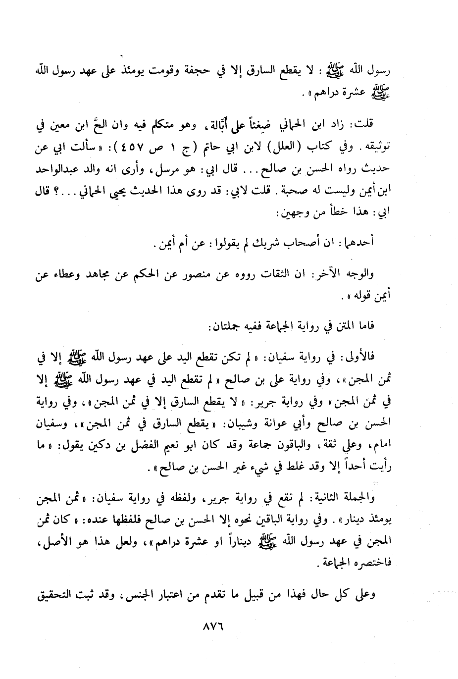فالأولى: في رواية سفيان: «لم تكن تقطع اليد على عهد رسول الله صلى الله عليه وسلم الا في ثمن المجن» . وفي رواية علي بن صالح: «لم تقطع اليد في عهد رسول الله صلى الله عليه وسلم الا في ثمن المجن» . وفي رواية جرير: «لا يقطع السارق الا في ثمن المجن» . وفي رواية الحسن بن صالح وأبي عوانة وشيبان: «يقطع السارق في ثمن المجن» . وسفيان إمام، وعلي ثقة، والباقون جماعة وقد كان أبو نعيم الفضل بن دكين يقول: «ما رأيت أحداً إلا وقد غلط في شيء غير الحسن بن صالح» .