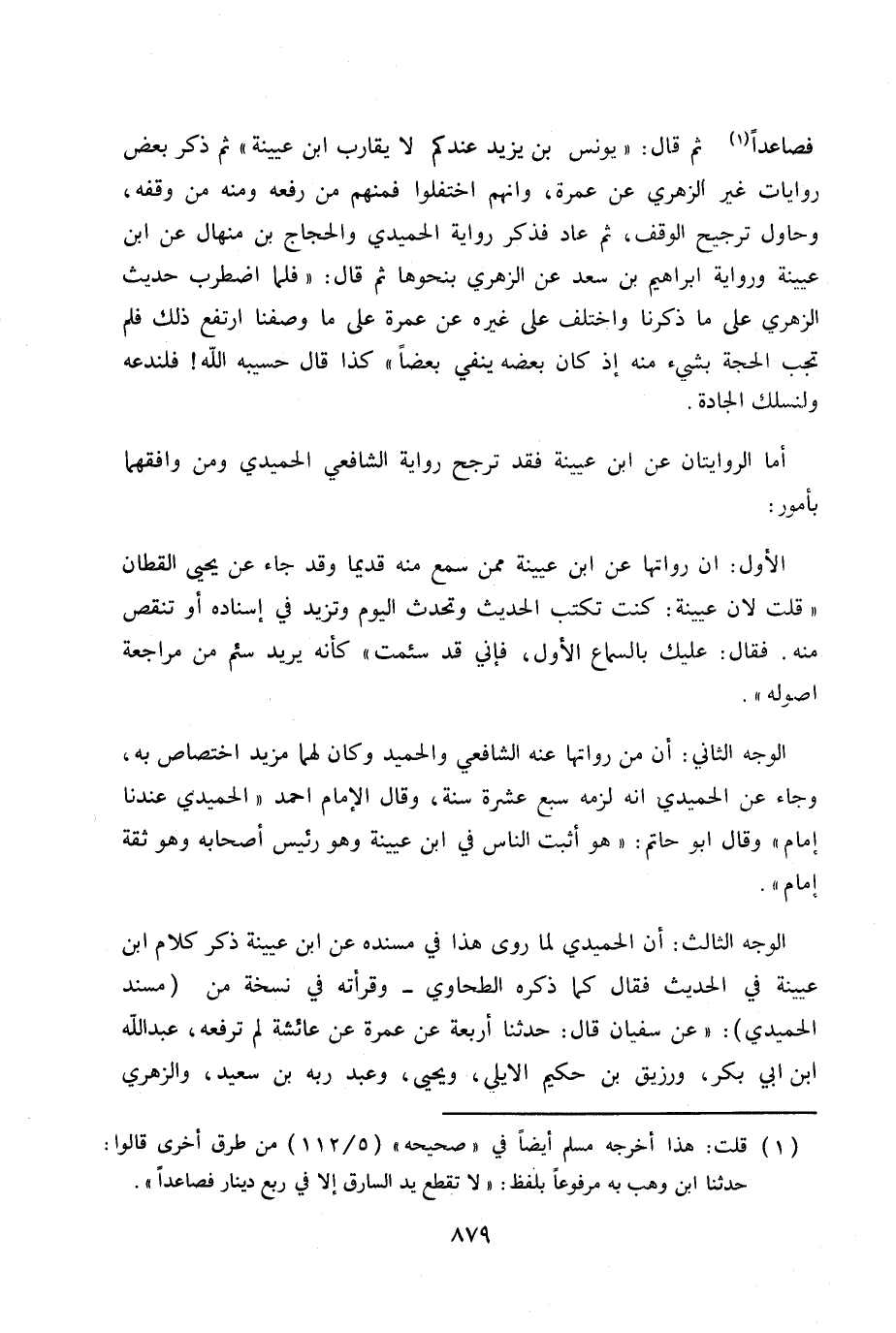 الوجه الثالث: ان الحميدي لما روى هذا في مسنده عن ابن عينة ذكر كلام ابن عيينة في الحديث فقال كما ذكره الطحاوي - وقرأته في نسخة من (مسند الحميدي) : «عن سفيان قال: حدثنا اربعة عن عمرة عن عائشة لم ترفعه، عبد الله بن أبي بكر، ورزيق بن حكيم الأيلي، ويحيى، وعبد ربة بن سعيد، والزهري