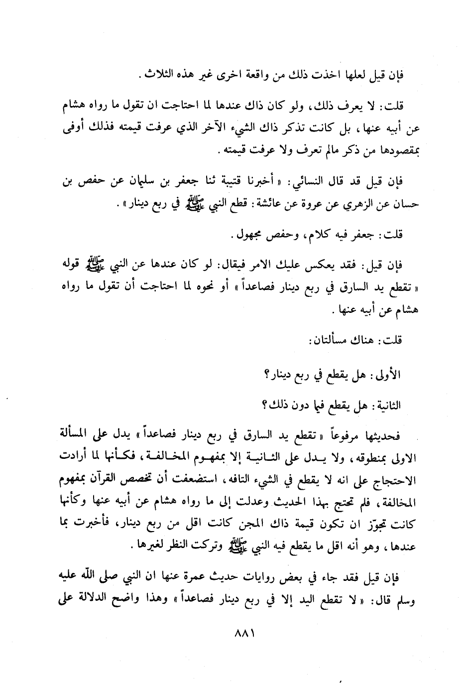 فإن قيل، فقد يعكس عليك الأمر فيقال، لو كان عندها عن النبي صلى الله عليه وسلم قوله «تقطع يد السارق في ربع دينار فصاعداً» اونحوه لما احتاجت ان تقول ما رواه هشام عن أبيه عنها.