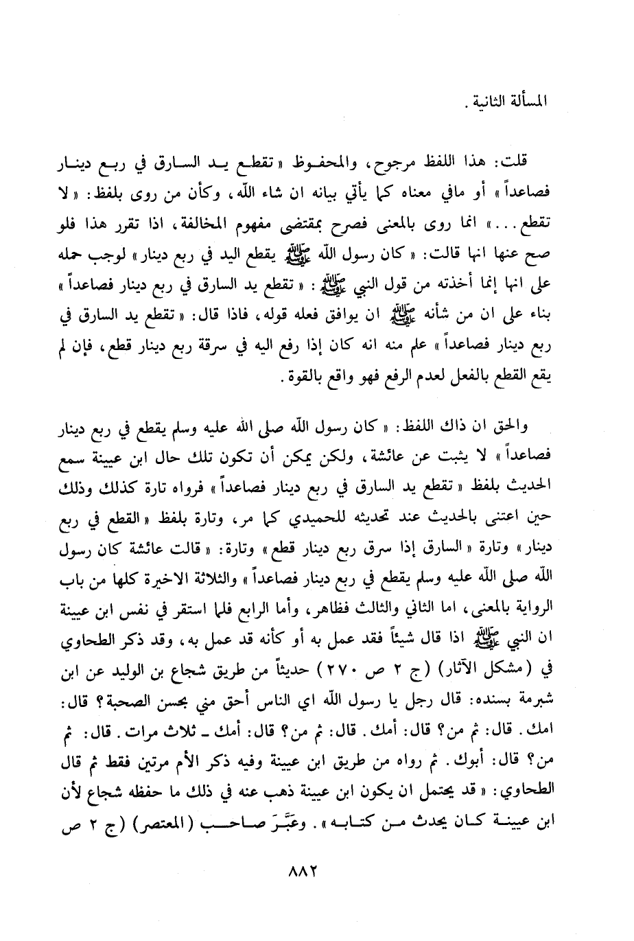 والحق ان ذاك اللفظ «كان رسول الله - صلى الله عليه وسلم - يقطع فير ربع دينار فصاعداً» لا يثبت عن عائشة، ولكن يمكن ان تكون تلك حال ابن عيينة سمع الحديث بلفظ «) تقطع يد السارق في ربع دينار فصاعداً) فرواه تارة كذلك وذلك حين اعتنى بالحديث عنه تحديثه للحميدي كما مر، وتارة بلفظ «القطع في ربع دينار» ، وتارة «السارق اذا سرق ربع دينار قطع» وتارة: «قالت عائشة كان رسول الله - صلى الله عليه وسلم - يقطع في ربع دينار فصاعداً» والثلاثة الأخيرة كلها من باب الرواية بالمعنى، اما الثاني والثالث فظاهر، واما الرابع فلما استقر في نفس ابن عيينة ان النبي - صلى الله عليه وسلم - اذا قال شيئاً فقد عمل به اوكأنه قد عمل به، وقد ذكر الطحاوي في (مشكل الآثار) ج 2 ص 270 حديثاً من طريق شجاع بن الوليد عن ابن شبرمة بسنده: قال رجل يا رسول الله أي الناس أحق مني بحسن الصحبة؟ قال: أمك. قال: ثم من؟ قال: أمك. قال: ثم من؟ قال أمك - ثلاث مرات. قال: ثم من؟ قال أبوك. ثم رواه من طريق ابن عيينة وفيه ذكر كلام الأم مرتين فقط ثم قال الطحاوي: «قد يحتمل أن يكون ابن عيينة ذهب عنه في ذلك ما حفظه شجاع لأن ابن عيينة كان يحدث من كتابه» وعَبَّرَ صاحب (لمعتصر) (ج 2 ص