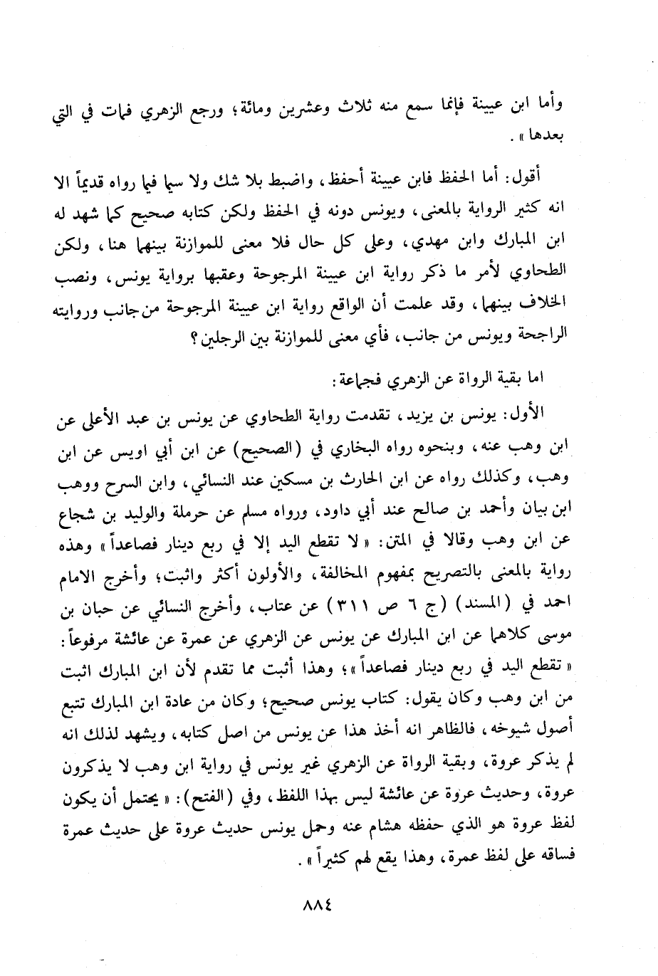 الأول: يونس بن يزيد. تقدمت رواية الطحاوي عن يونس بن عبد الاعلى عن ابن مهب عنه، وبنحوه رواه البخاري في (الصحيح) عن ابن أبي أويس عن ابن وهب، وكذلك رواه عن ابن وهب الحارث بن مسكين عند النسائي، وابن السرح ووهب بن بيان وأحمد بن صالح عند أبي داود، ورواه مسلم عن حرملة والوليد بن شجاع عن ابن وهب وقالا في المتن: «لا تقطع اليد إلا في ربع دينار فصاعداً» وهذه رواية بالمعنى بالتصريح بمفهوم المخالفة، والاولون أكثر وأثبت. وأخرج الامام أحمد (المسند) ج 6 ص 311 عن عتاب، وأخرج النسائي عن حبان بن موسى كلاهما عن ابن المبارك عن يونس عن الزهري عن عمرة عن عائشة مرفوعاً: «تقطع اليد في ربع دينار فصاعداً» . وهذا أثبت مما تقدم لأن أبن المبارك أثبت من ابن وهب وكان يقول: كتاب يونس صحيح. وكان من عادة ابن المبارك تتبع أصول شيوخه، فالظاهر أنه أخذ هذا عن يونس من أصل كتابه، ويشد لذلك أنه لم يذكر عروة، وبقية الرواية عن الزهري غير يونس في رواية ابن وهب لا يذكرون عروة، وحديث عروة عن عائشة ليس بهذا اللفظ، وفي (الفتح) : «يحتمل أن يكون لفظ عروة هو الذي حفظه هشام عنه وحمل يونس حديث عروة على حديث عمرة فساقه على لفظ عمرة، وهذا يقع لهم كثيراً» .