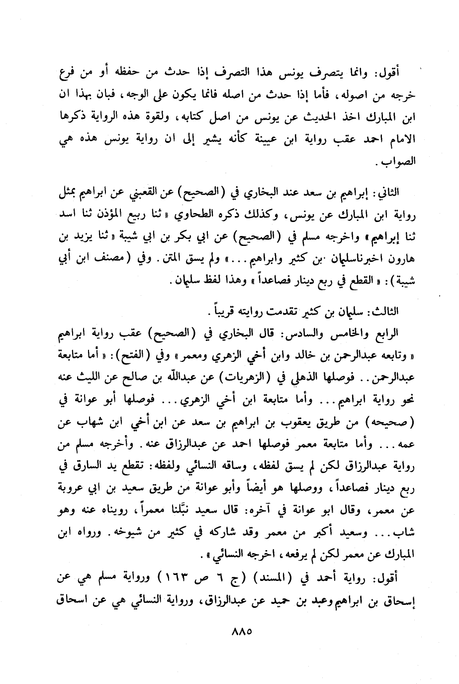 الثاني: إبراهيم بن سعد عند البخاري في (الصحيح) عن القعنبي عن إبراهيم بمثل رواية ابن المبارك عن يونس. وكذلك ذكره الطحاوي «ثنا ربيع المؤذن ثنا أسد ثنا إبراهيم، وأخرجه مسلم في (الصحيح) عن أبي بكر بن أبي شيبة «ثنا يزيد بن هارون أخبرنا سليمان ابن كثير وإبراهيم ... » ولم يسق المتن. وفي (مصنف ابن أبي شيبة) : «القطع في ربع دينار فصاعداً» وهذا لفظ سليمان.